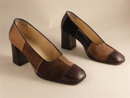 DECOLLETÈ CON PUNTA SQUADRATA IN PELLE E SUEDE - BROWN LEATHER AND SUEDE DECOLLETÈ Braccialini Firenze nei toni del marrone con cuciture a zigzag e tacco a campana, difetti tg 36