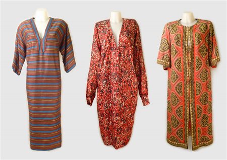 TRE CORPICOSTUMI IN COTONE - THREE COTTON BEACH ROBES uno con stampa batik nei toni del rosso e del Bordeaux a maniche ampie e piccoli bottoni in tono, uno nei toni del rosso e giallo ed un altro nei toni del marrone a righe gialle e azzurre tg M circa