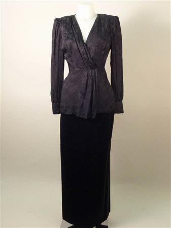 COMPOSÈ IN CREPE DI RASO NERO - BLACK SATIN COMPOSÈ UNA CAMICIA NERA IN CRÈPE SATIN fantasia floreale, plisettatura a chiusura incrociata sul davanti, maniche lunghe e gonna longuette in velluto nero tg M circa