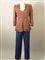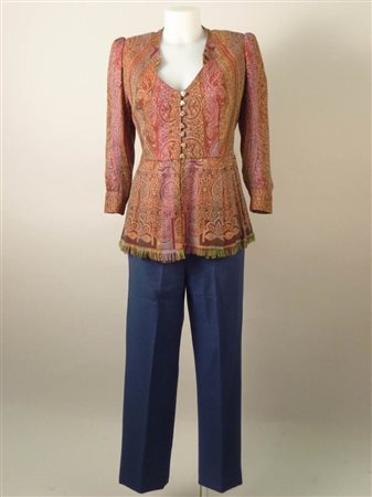 COMPOSÈ IN LANA - WOOL COMPOSÈ GIACCA con taglio a corpino, tessuto fantasia nei toni del rosa, bordeux, verde e giallo, maniche a tre quarti, pantaloni blu a linea dritta tg M circa