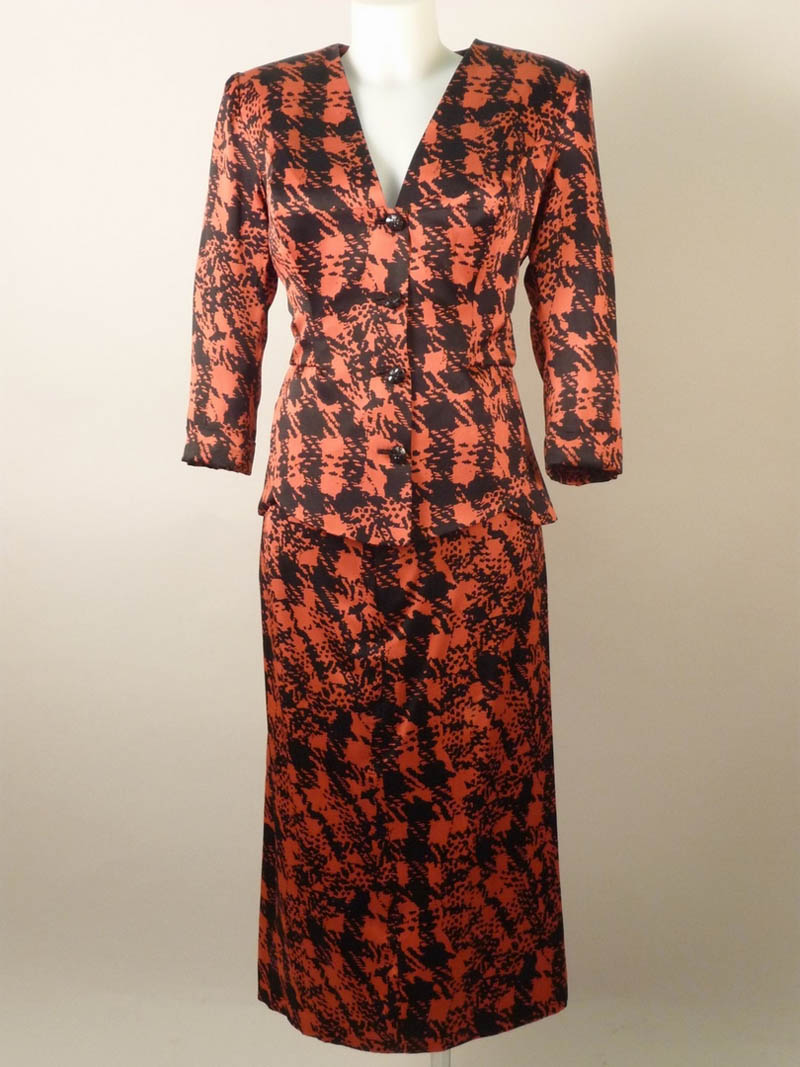 COMPOSE IN RASO PIED DE POULE - PIED DE POULE IN SATIN SUIT giacca a fantasia nei toni del rosso e nero, chiusura a quattro bottoni, maniche a tre quarti e longuette tg M circa