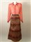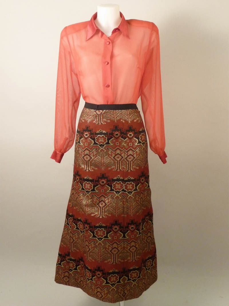 COMPOSÈ DA SERA ROSSO - RED EVENING COMPOSÈ una camicia rosso vivo con colletto in raso, bottoni rivestiti e una gonna svasata a motivi orientali - geometrici realizzati con fili lamè nei toni del bodeux, nero e oro (2) tg L circa
