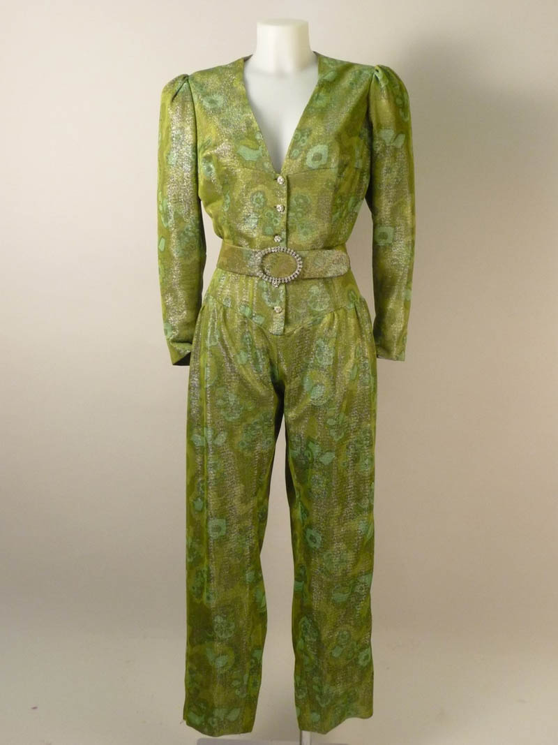 TUTINA VERDE LAMINATA - GREEN LAMÈ SUIT Anni Ottanta scollo a V, apertura sul davanti con bottoni gioiello, maniche lunghe, vita bassa, cintura con fibbia impreziosita da strass tg M circa