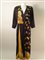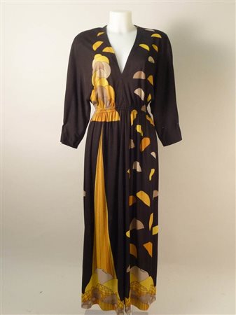 ABITO NERO FANTASIA - BLACK FANCY DRESS Desiree scollo a V, arricciatura in vita, fantasia nei toni del giallo a motivi geometrici su fondo nero, maniche a tre quarti, lievi difetti tg S circa