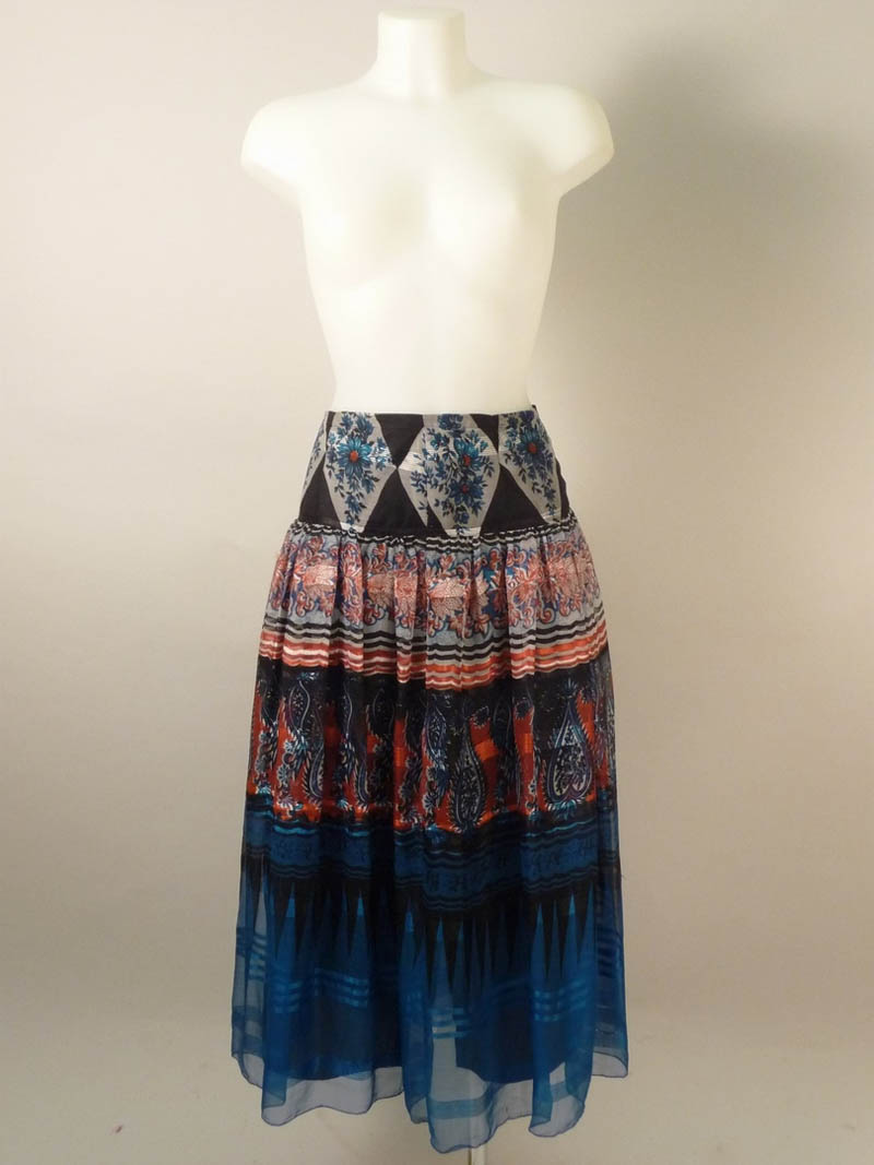 GONNA IN ORGANZA A FANTASIA - SKIRT QITH FANTASY PATTERN vita bassa, fantasia nei toni del rosso, nero, bianco e azzurro, linea svasata tg M circa