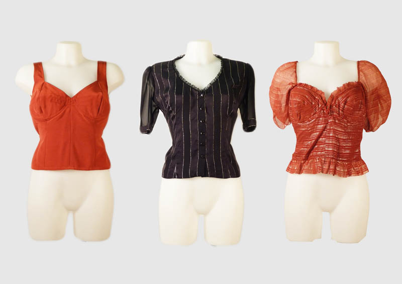 TRE CORPETTI - THREE BODICE'S uno in crepe rossa e fantasia a righe dorate, maniche corte arricciate un altro in raso nero con ampie maniche a sbuffo e dettagli in pizzo e l'ultimo, una canottiera realizzata a corpetto in tessuto rosso tg M circa