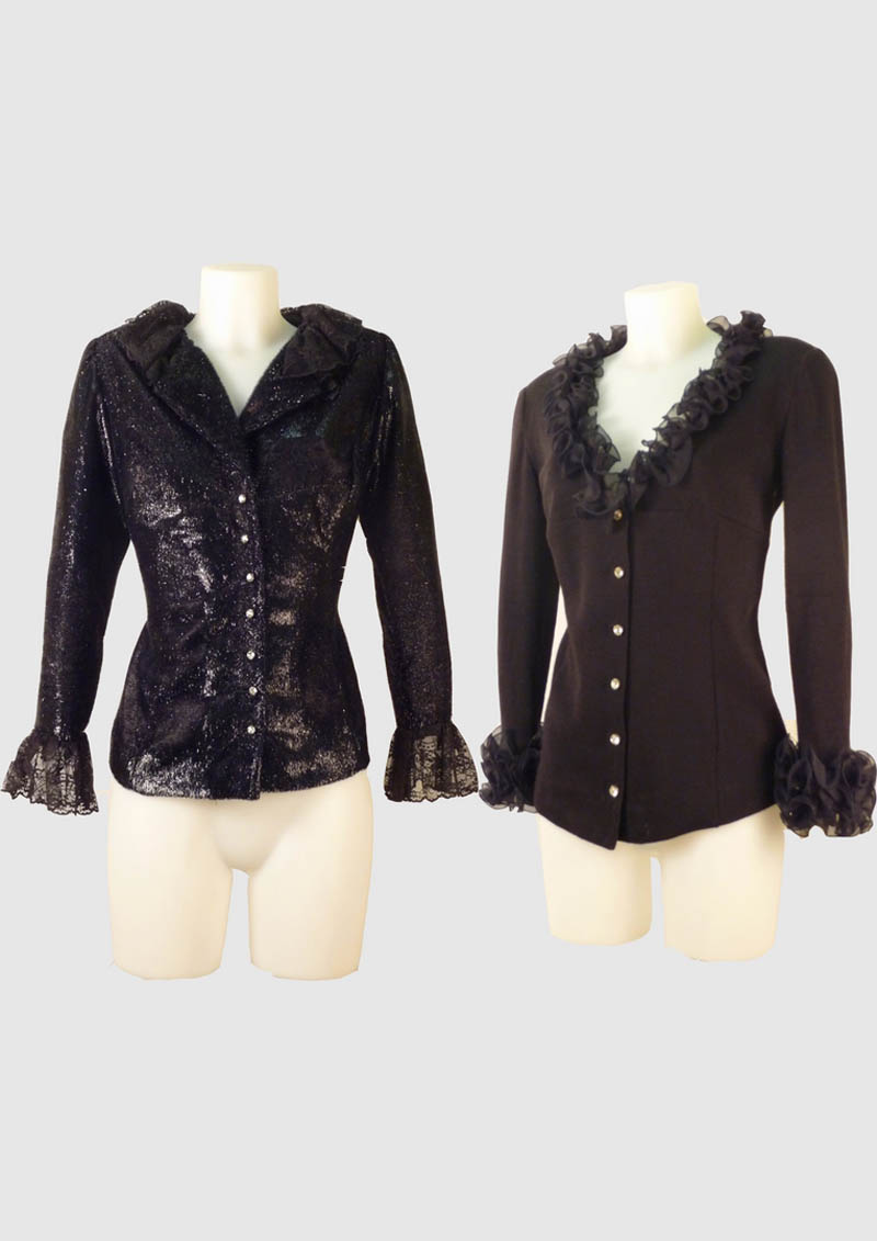 LOTTO - LOT una giacchina in vellutino laminato con applicazioni in pizzo nero ed un cardigan bordato su collo e polsi con rouches nere in chiffon, bottoni gioiello, lievi difetti tg M circa (2)