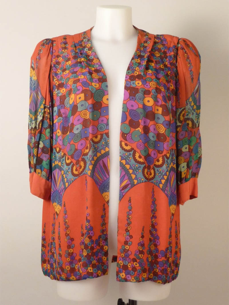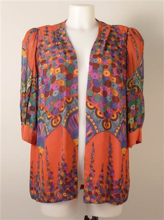 CAMICIETTA IN CREPE A FANTASIA COLORATA - PATTERNED BLOUSE motivi geometrici nei toni del giallo, verde, viola e blu, maniche a tre quarti tg M cicrca