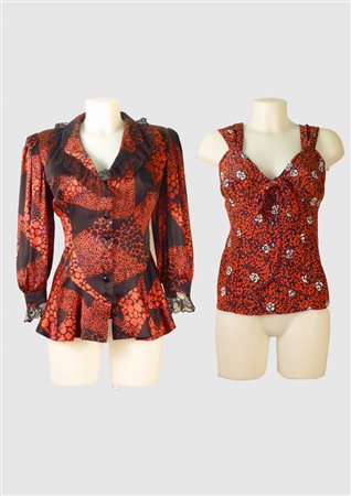 DUE CAMICIETTE FANTASIA - TWO PAINTED BLOUSE una camicia con scollo bordato in pizzo nero e fantasia nei toni del rosso su fondo nero ed un'altra simile a canottiera tg M circa