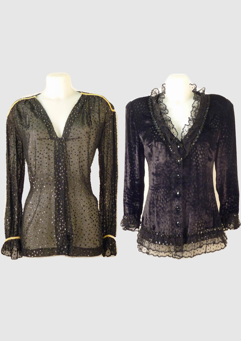 DUE CAMICIETTE - TWO SWEATHERS una nera in organza con dettagli dorati in passamaneria, e lamè a pois dorato ed un'altra in vellutino nero con dettagli in pizzo e passamaneria in paillettes bottoni neri sfacettati, lievi difetti tg M circa
