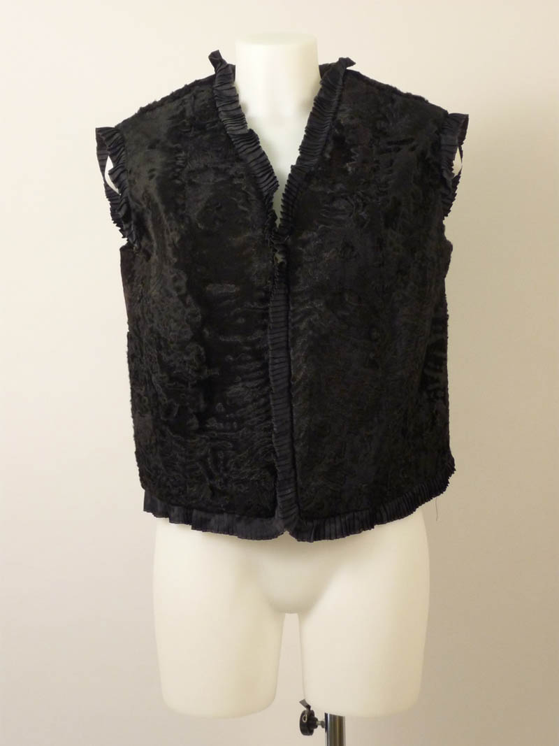 GILET IN ASTRAKAN - ASTRAKAN GILET Anni Ottanta bordato con plissettatura in raso nero, interno in raso tg S circa