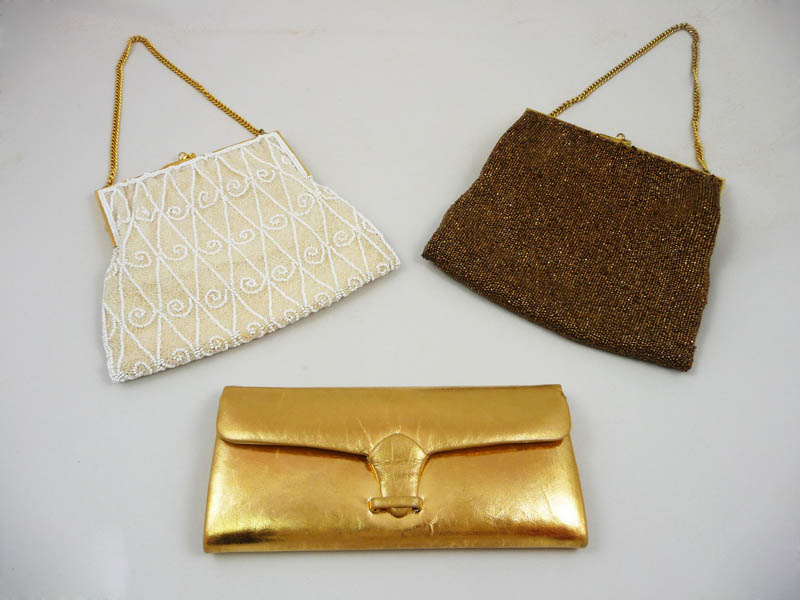 QUATTRO BORSETTE DA SERA - FOUR EVENING BAGS tra cui una in maglina di metallo dorata, due in perline, una nei toni del bronzo e una del bianco entrambe con chiusura in metallo dorato e strass