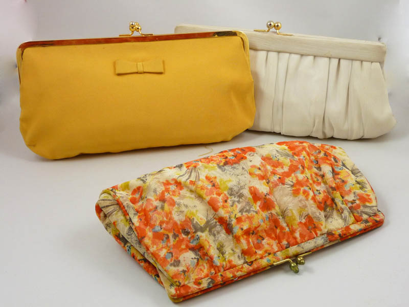 TRE POCHETTE - THREE CLUNCH di vari colori simili tra loro, di cui una in organza bianca con chiusura a scatto in metallo dorato, lievi difetti
