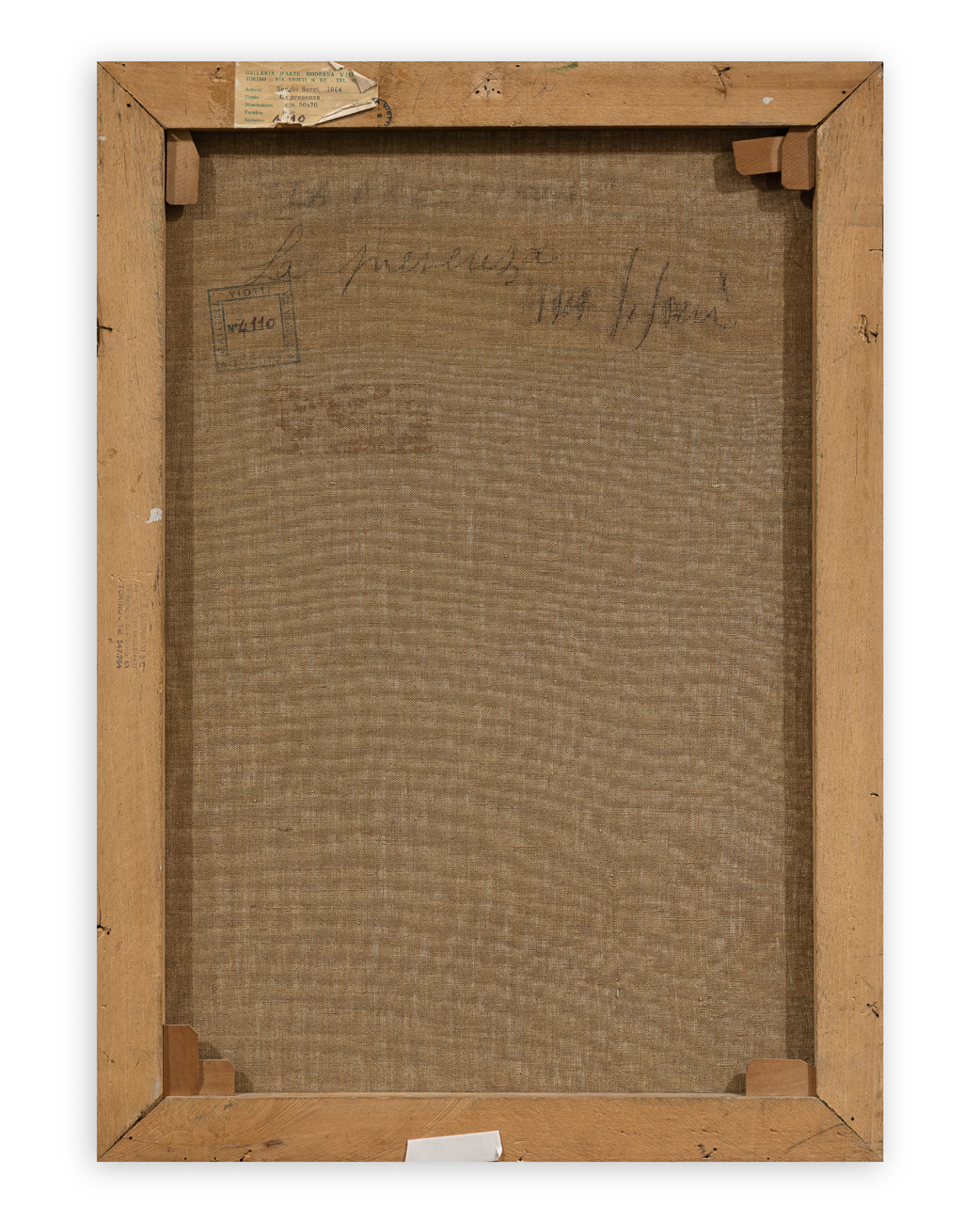 Etichetta e timbri della Galleria Viotti (TO), con caratteristiche tecniche dell'opera, al retro