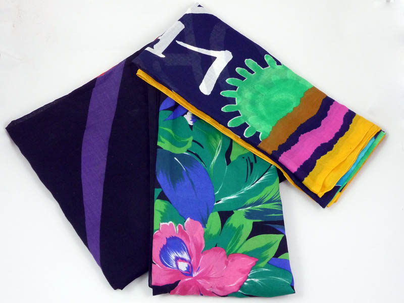 LOTTO DI PAREI - BEACHWRAPS LOT uno sintetico con motivi colorati su fondo azzurro e uno a lamè nei toni del viola, lievii difetti (3)