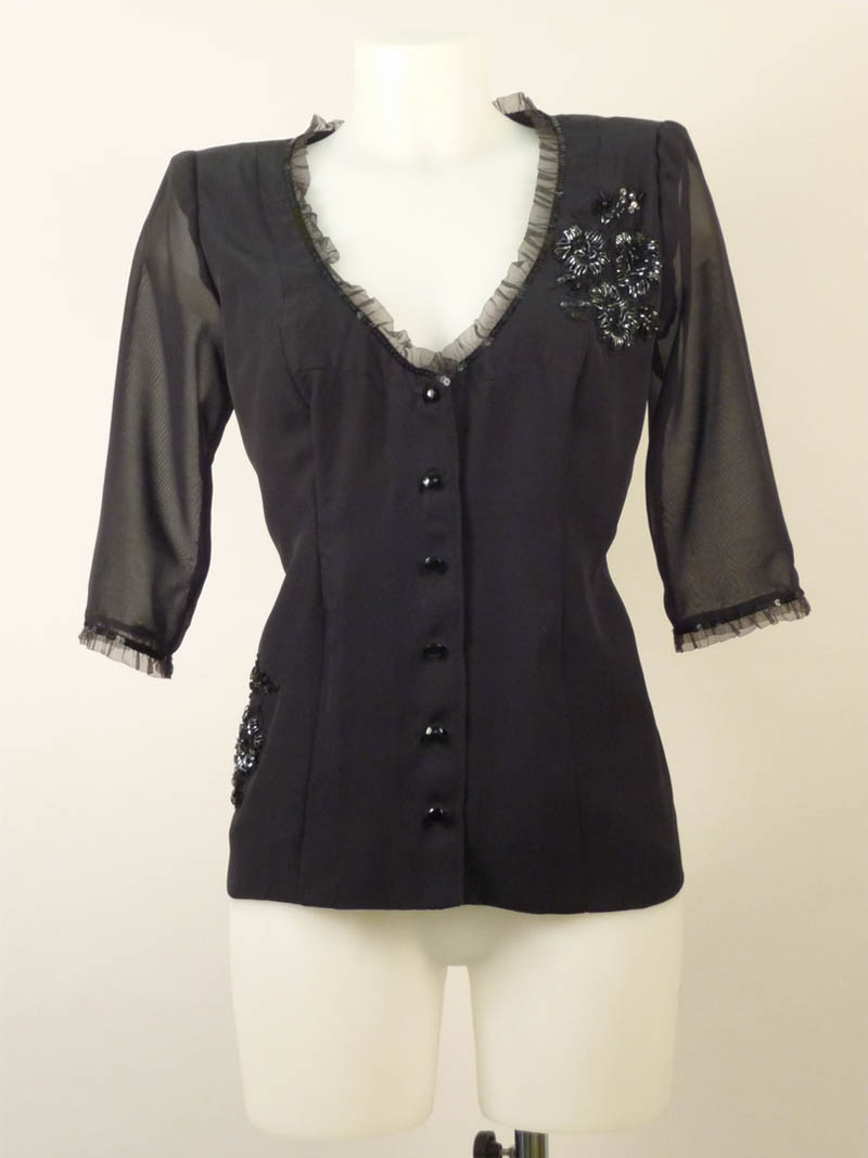 CAMICIA NERA IN CREPE - BLACK BLOUSE IN CREPE scollo profondo a V bordato da plisettatura in pizzo nero e paillettes, ricami vari a motivi floreali in pizzo e perline tg M circa