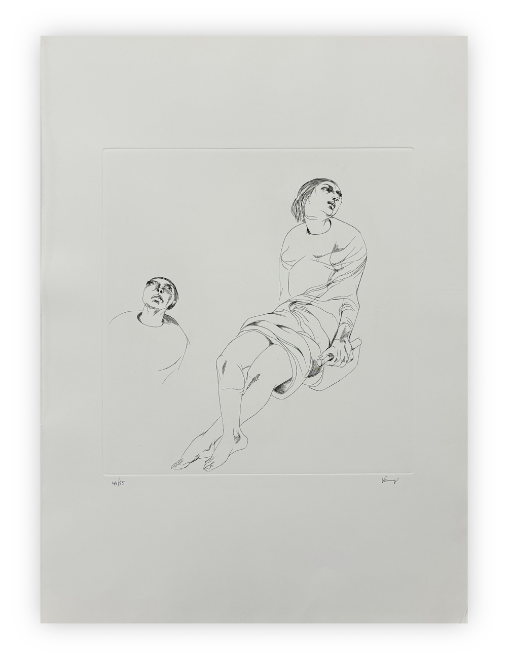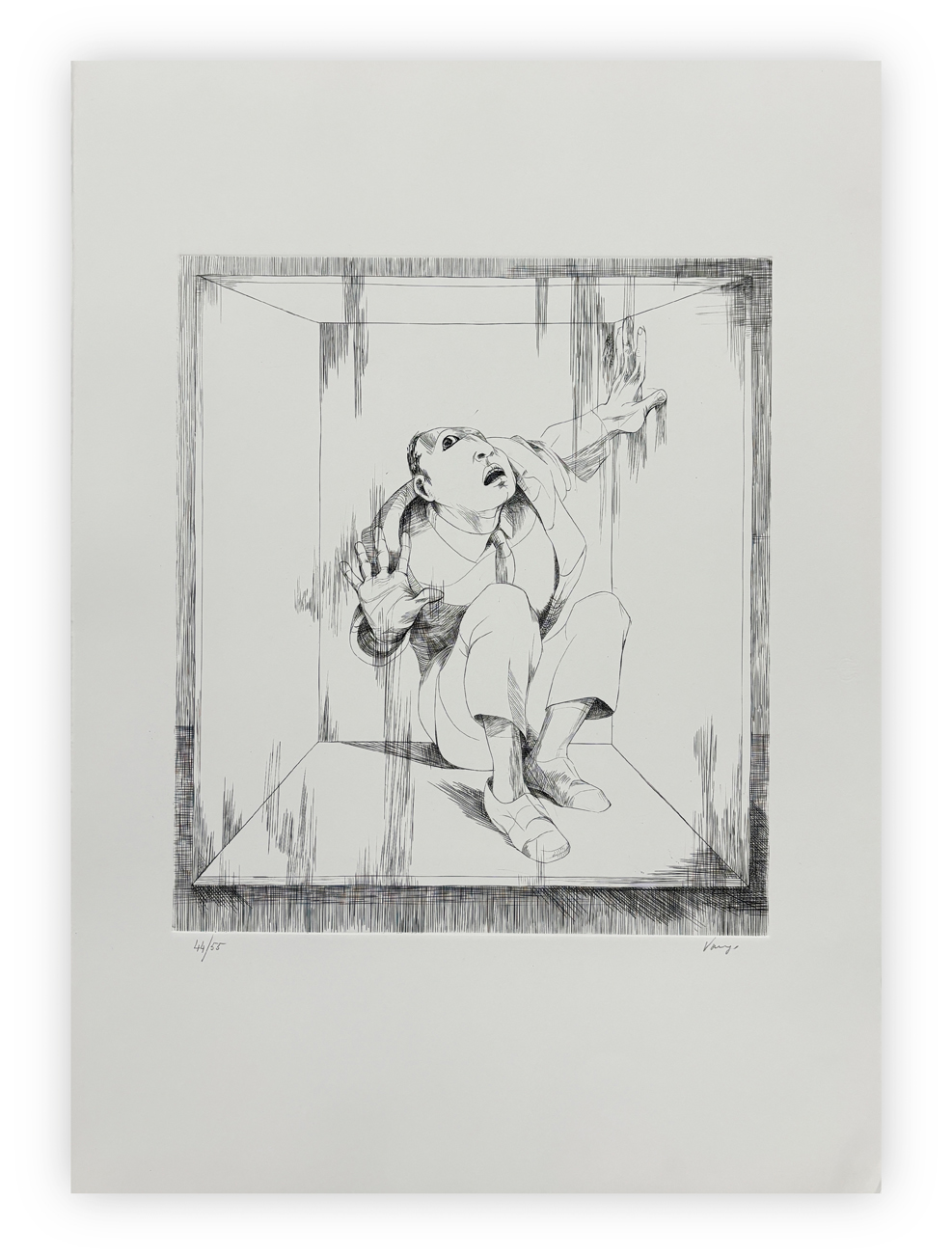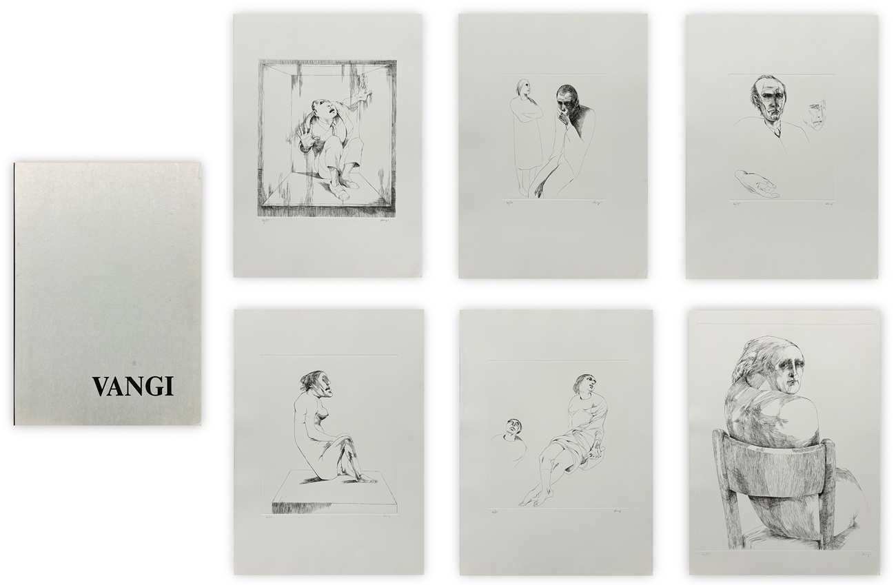 Cartella contenente testo di presentazione di Pier Carlo Santini e sei incisioni a bulino di Giuliano Vangi, ciascuna recante firma e numerazione (Esemplari 44/55) a matita al fronte