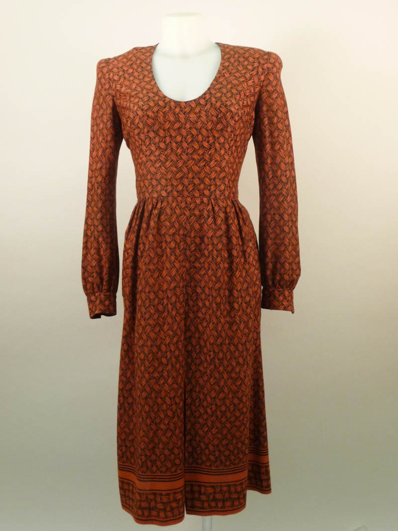 ABITO IN LANA A FANTASIA ARANCIONE - ORANGE WOOL PATTERN DRESS scollo rotondo, corpino avvitato e gonna a linea dritta, lievi difetti tg M circa