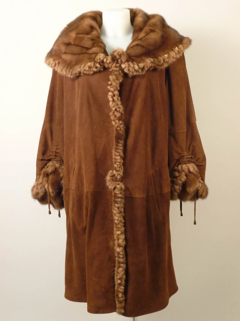 CAPPOTTO MARRONE IN PELLE SUEDE E VISONE - MIINK AND SUEDE BROWN COAT collo ampio in pelliccia, maniche bordate e arricciate tg L circa