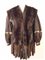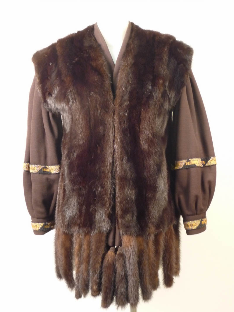 CAPPOTTO IN VISONE MARRONE - BROWN MINK COAT visone con codine, maniche in tessuto con bordure in perline di vari colori e applicazioni in tessuto a stampa maculata, lievi difetti tg L circa