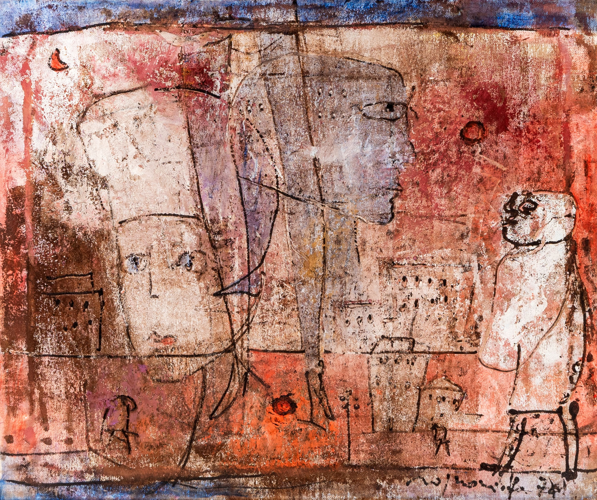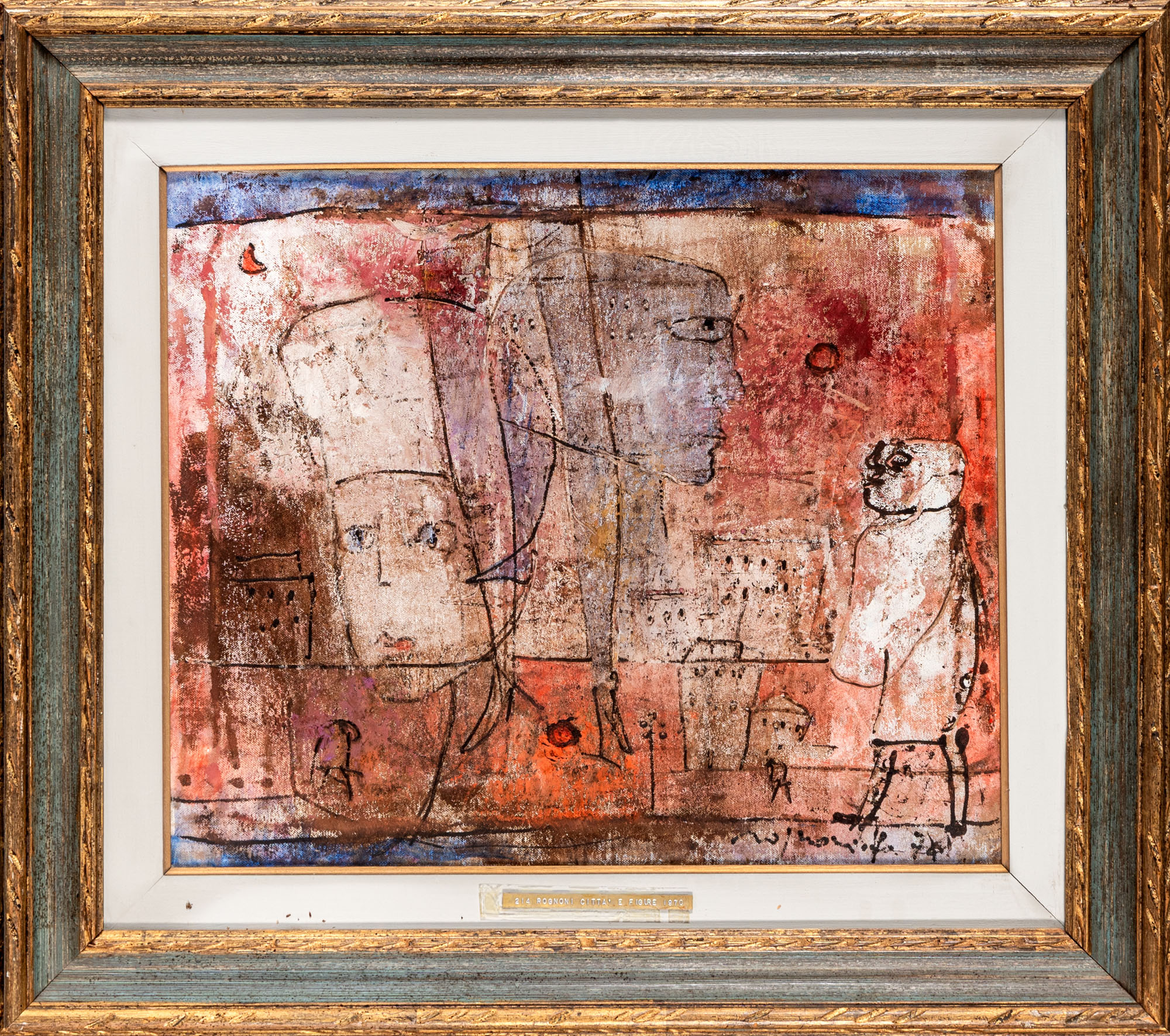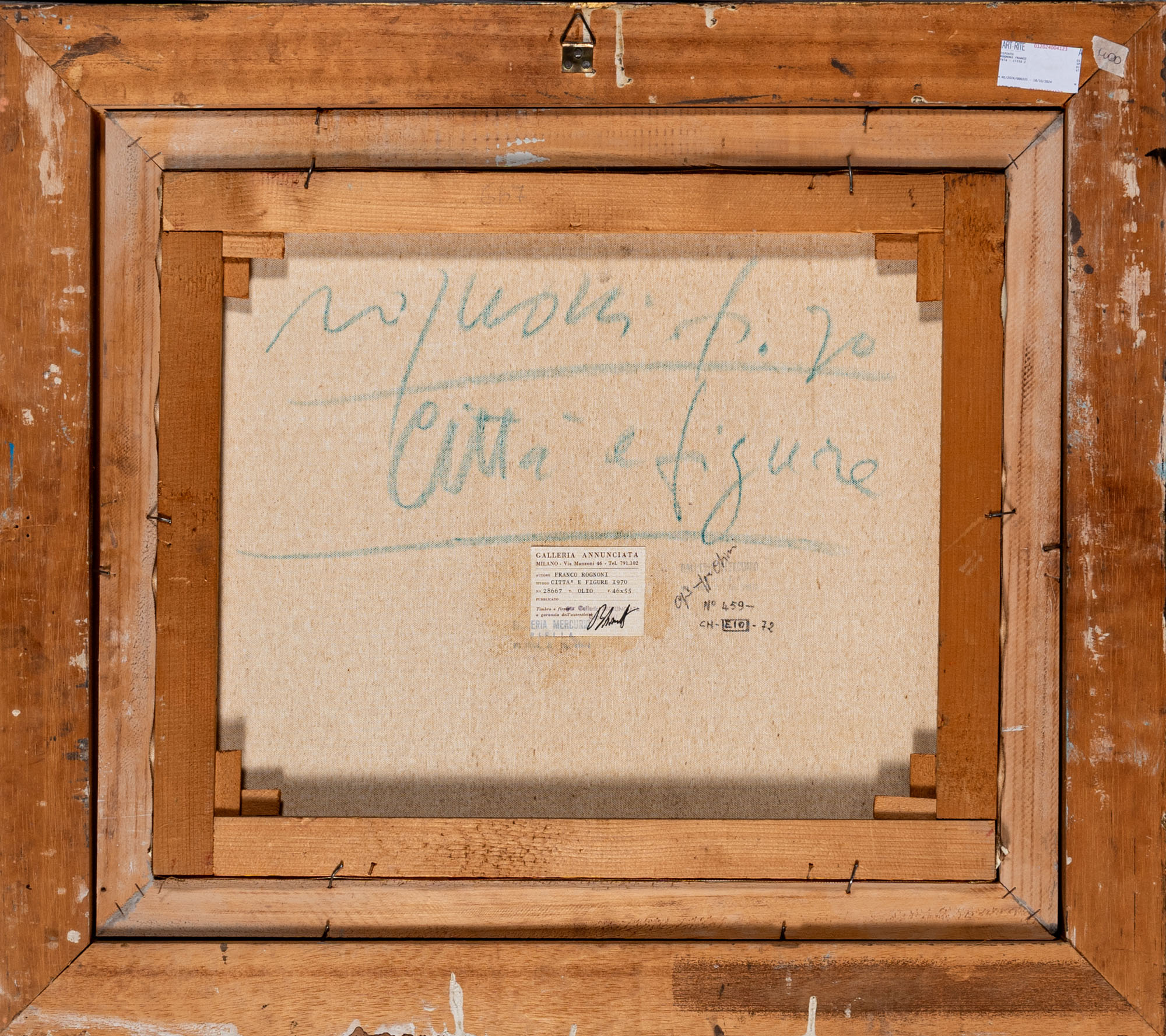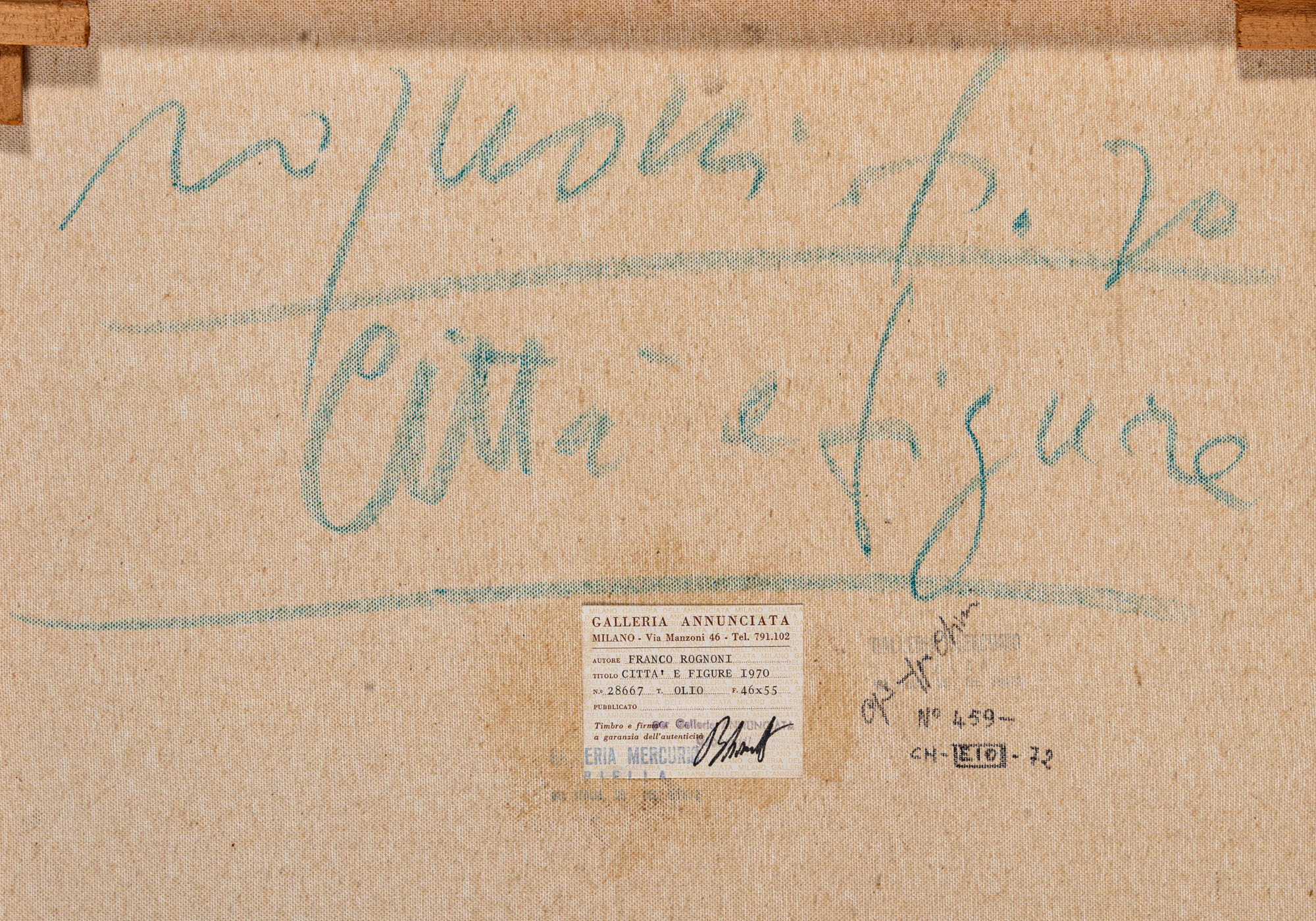 FRANCO ROGNONI(1913 - 1999)Città e figure1970Olio su tela46 x 55 cmFirmato e datato in basso a destraFirma, data e titolo al retroPROVENIENZA:Galleria Annunciata, Milano (etichetta al retro)Galleria Mercurio, Biella (timbri al retro)Collezione privata, Biella