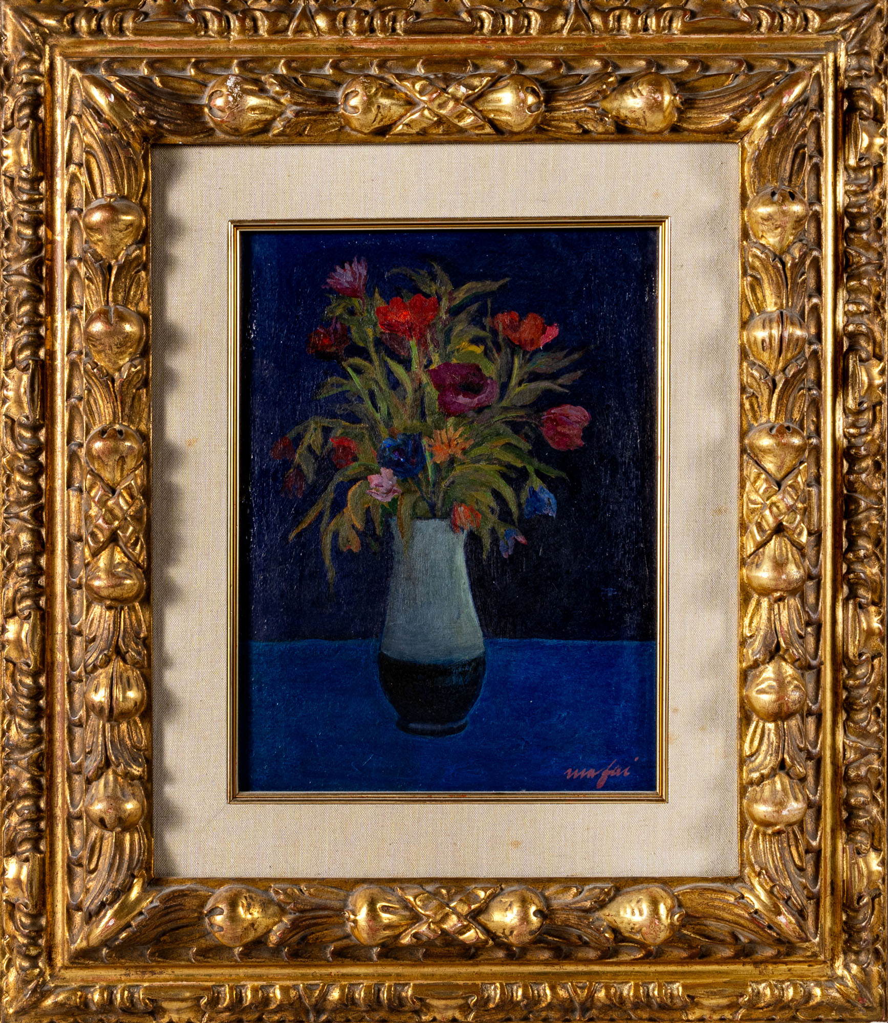 MARIO MAFAI(1902 - 1965)Fiori nel vaso1955 circaOlio su tavola38,5 x 28,5 cmFirmato in basso a destraOpera accompagnata da autentica su fotografia firmata da Giulia Mafai, figlia dell'artistaOpera accompagnata da autentica su fotografia a cura dell'Archivio della Scuola RomanaPROVENIENZA:Galleria Basile Arte Contemporanea, PalermoCollezione privata, Padova