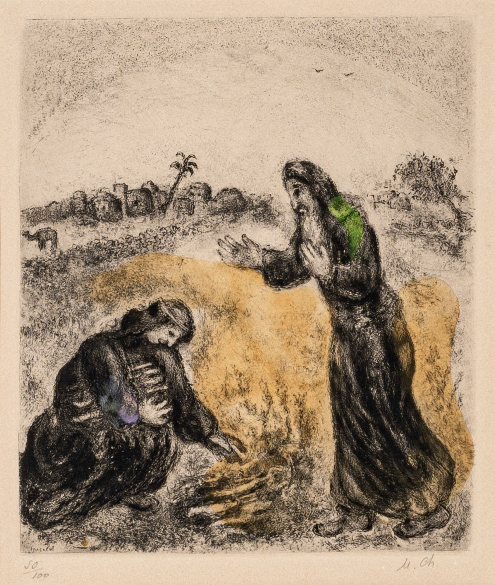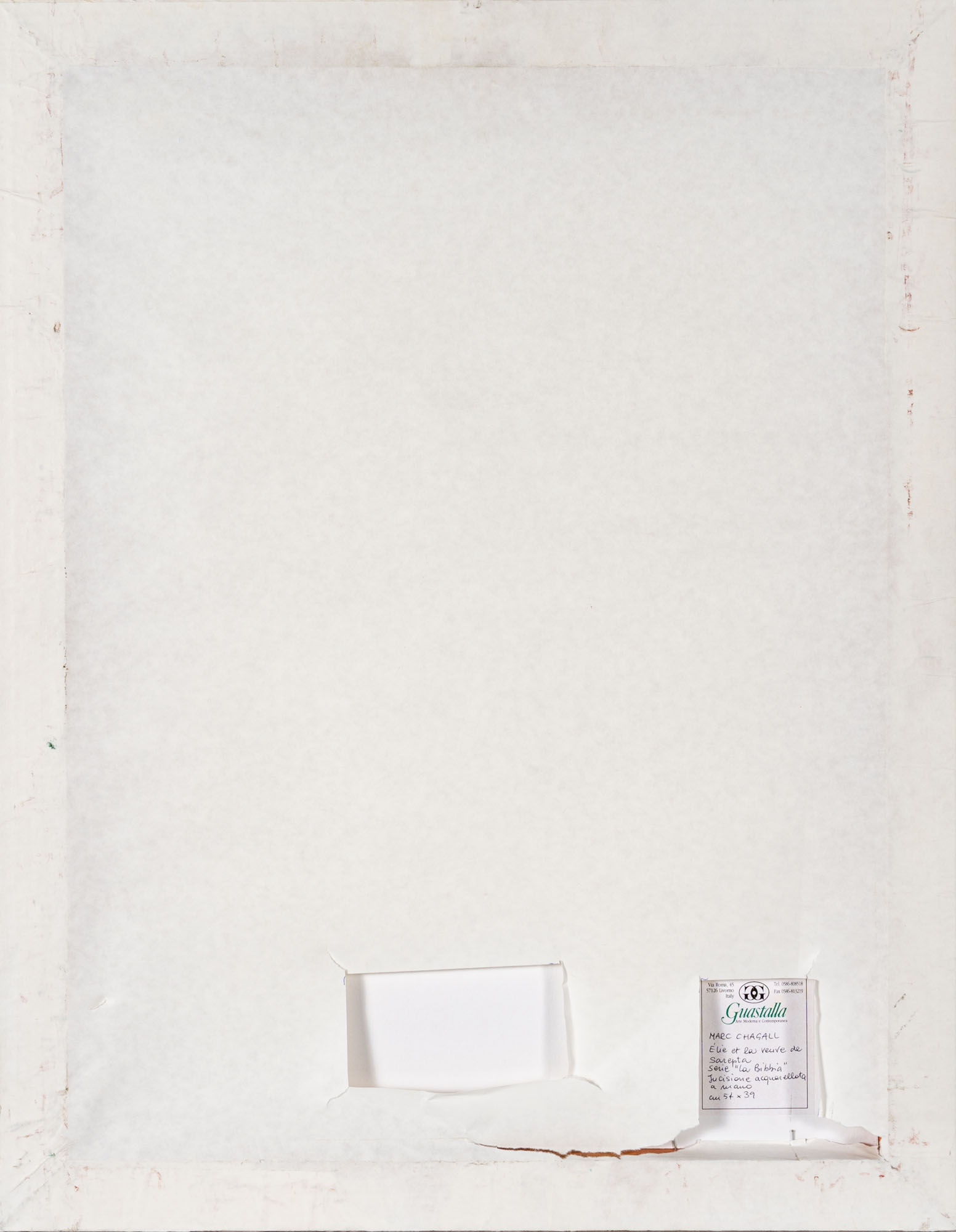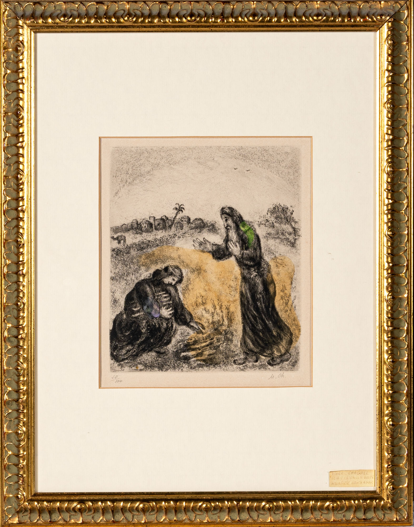 MARC CHAGALL(1887 - 1985)Elie et la veuve de Sarepta (Elia e la vedova di Zarepta, dalla serie La Bibbia)1958Acquaforte acquarellata a mano, es. 50/10054 x 39 cm (foglio)28,5 x 24,5 cm (lastra)Firmata in lastra in basso a sinistraSiglata a matita in basso a destra e numerata in basso a sinistraPROVENIENZA:Guastalla Arte Moderna e Contemporanea, Livorno (etichetta al retro)Collezione privata, PadovaBIBLIOGRAFIA:D. Piraina (a cura di), Chagall: la Bibbia, Rubbettino Editore, 2021, p. 73 (ill.)F. De Santi (a cura di), La Bibbia di Marc Chagall. Centocinque acqueforti dal 1931 al 1965, Edizioni Graphis Arte, 2000, p. 75
