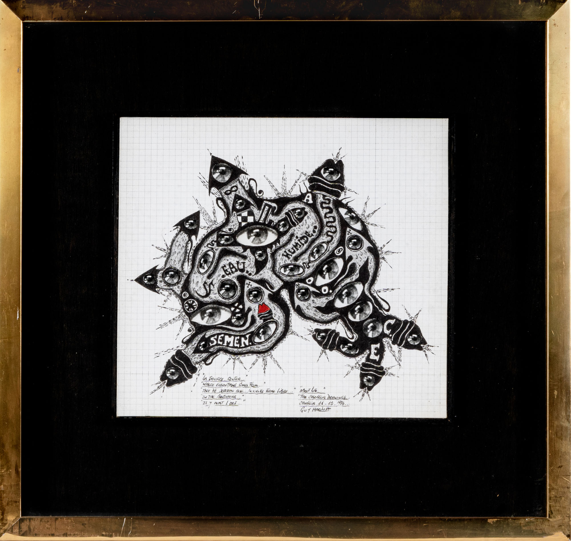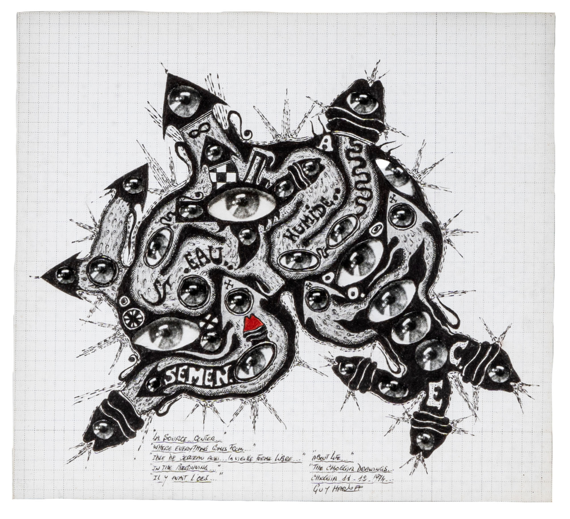 GUY HARLOFF(1933 - 1991)About life...1974Collage e inchiostri su carta quadrettata25,8 x 28,5 cmFirmato, datato e titolato in basso a destraOpera inserita nell'Archivio Guy Harloff e accompagnata da certificato di autenticità a cura dello Studio d'Arte Nicoletta Colombo, MilanoPROVENIENZA:Galleria Omar Aprile Ronda, Biella (timbro al retro)Collezione privata, Biella