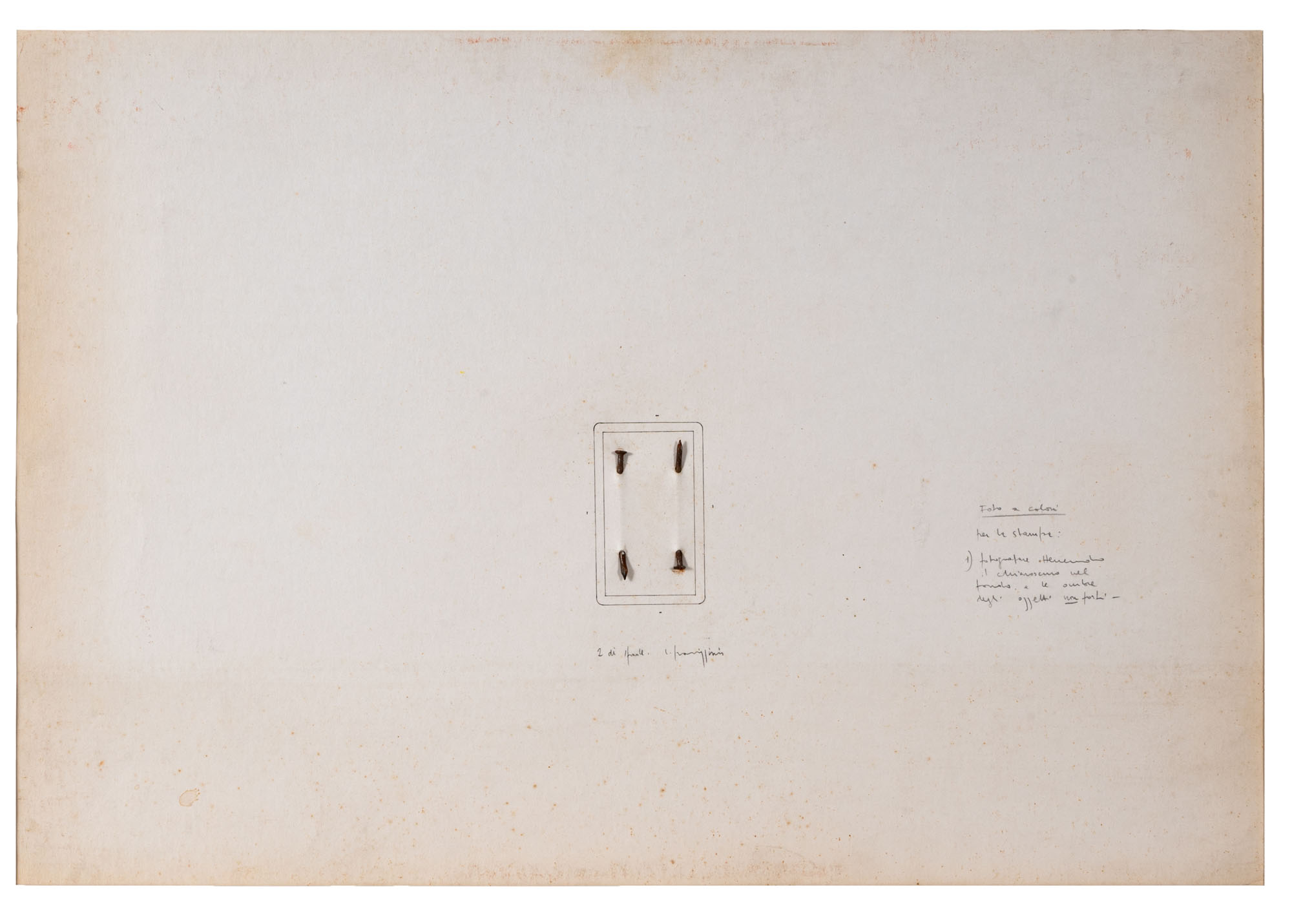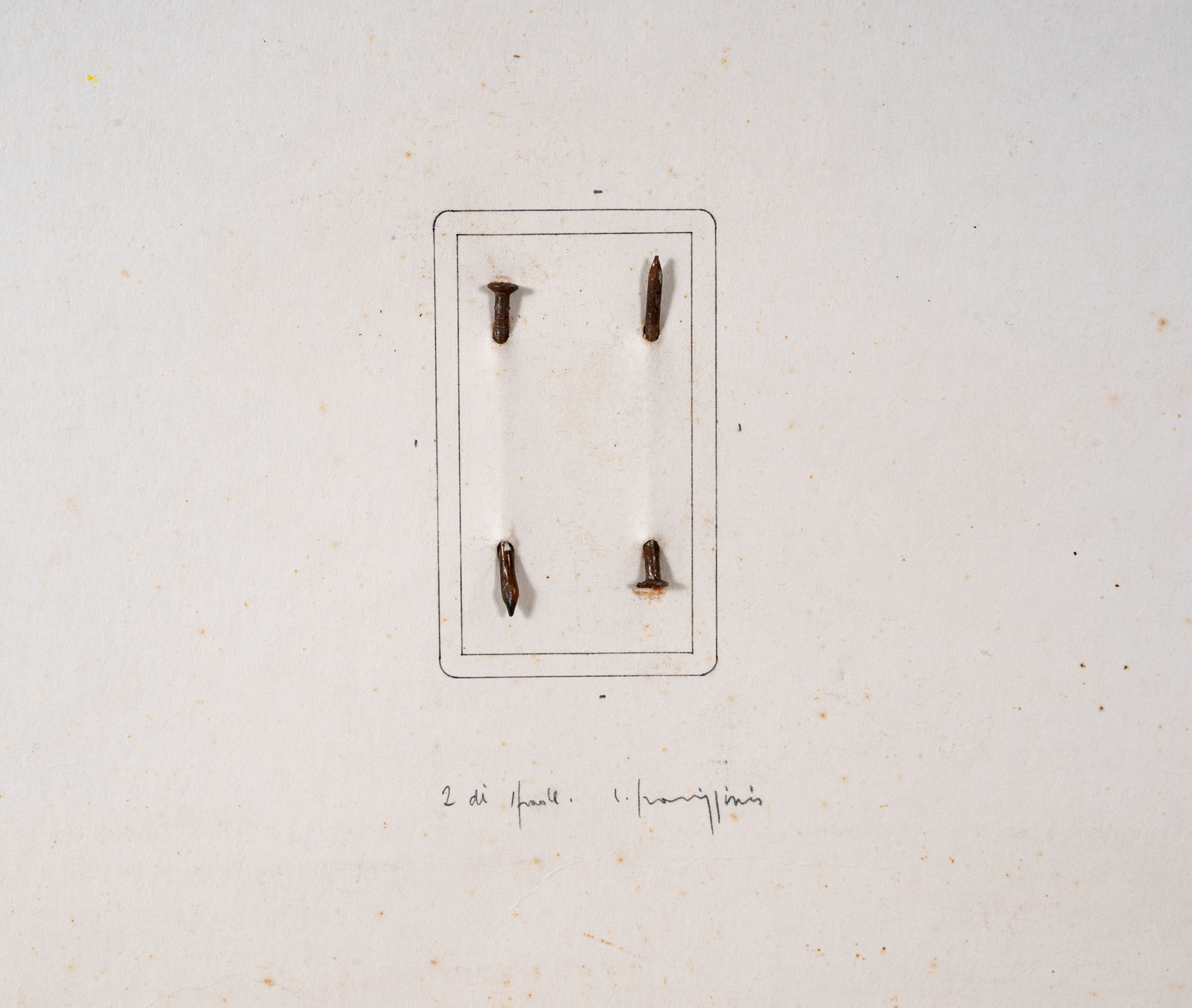 China su carta con chiodi applicati, opera unica concepita come contributo dell'autore alla cartella 40+1+3. Gioco delle carte 'Piacentine' con libera interpretazione di 44 artisti, Edizioni Pari&Dispari, Reggio Emilia, edita in occasione della Biennale di Venezia del 1972