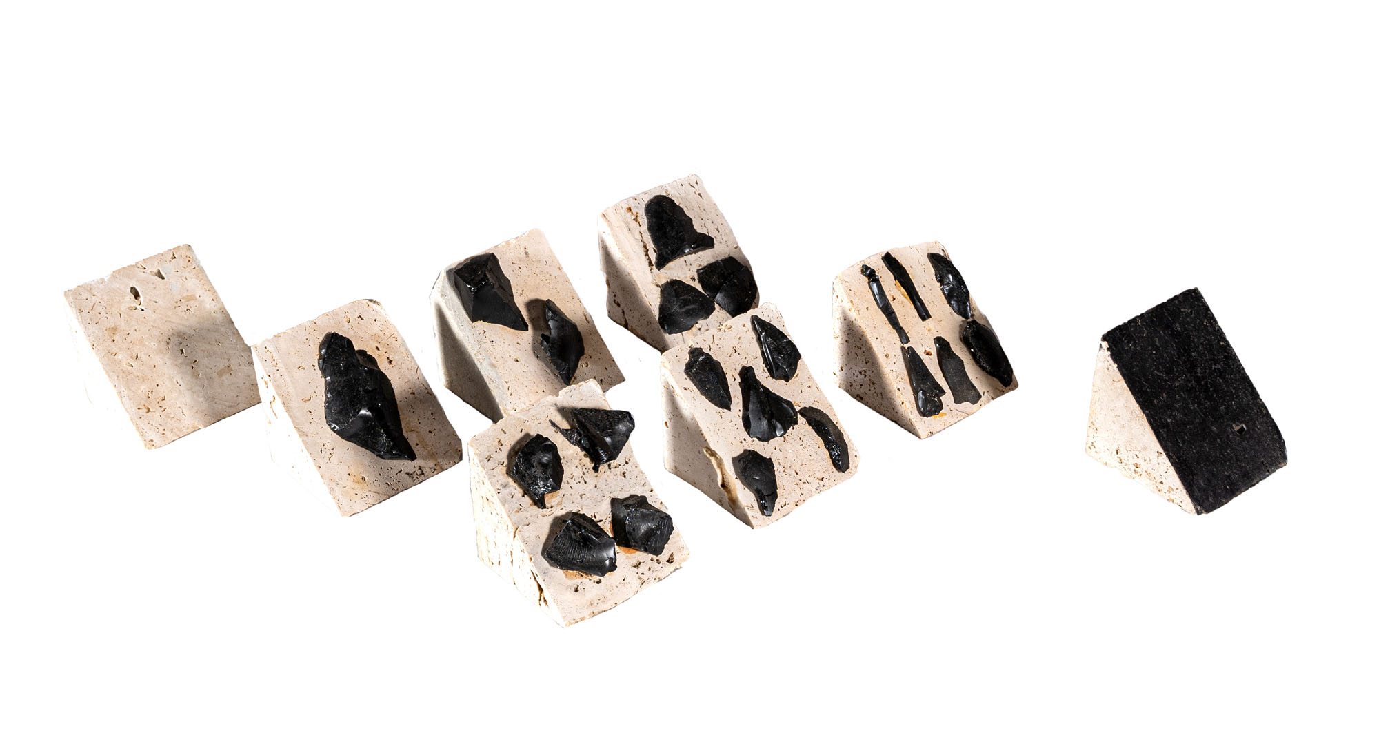 MIRELLA BENTIVOGLIO(1922 - 2017)Creazione e fine (I giorni della creazione)1982Scultura in travertino e catrame composta da otto elementiDimensioni variabiliOgni elemento misura 9,4 x 10 x 9 cmOpera accompagnata da tre autentiche su fotografia firmate dall'artistaPROVENIENZA:Collezione privata, Brescia