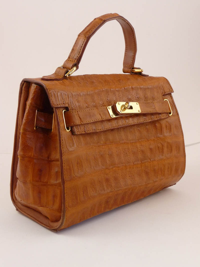 BORSA A MANO IN COCCODRILLO NOCCIOLA - BROWN HAND CROCODILE BAG modello Kelly, Anni Ottanta chiusura in metallo dorato, tracolla, interni in pelle beige