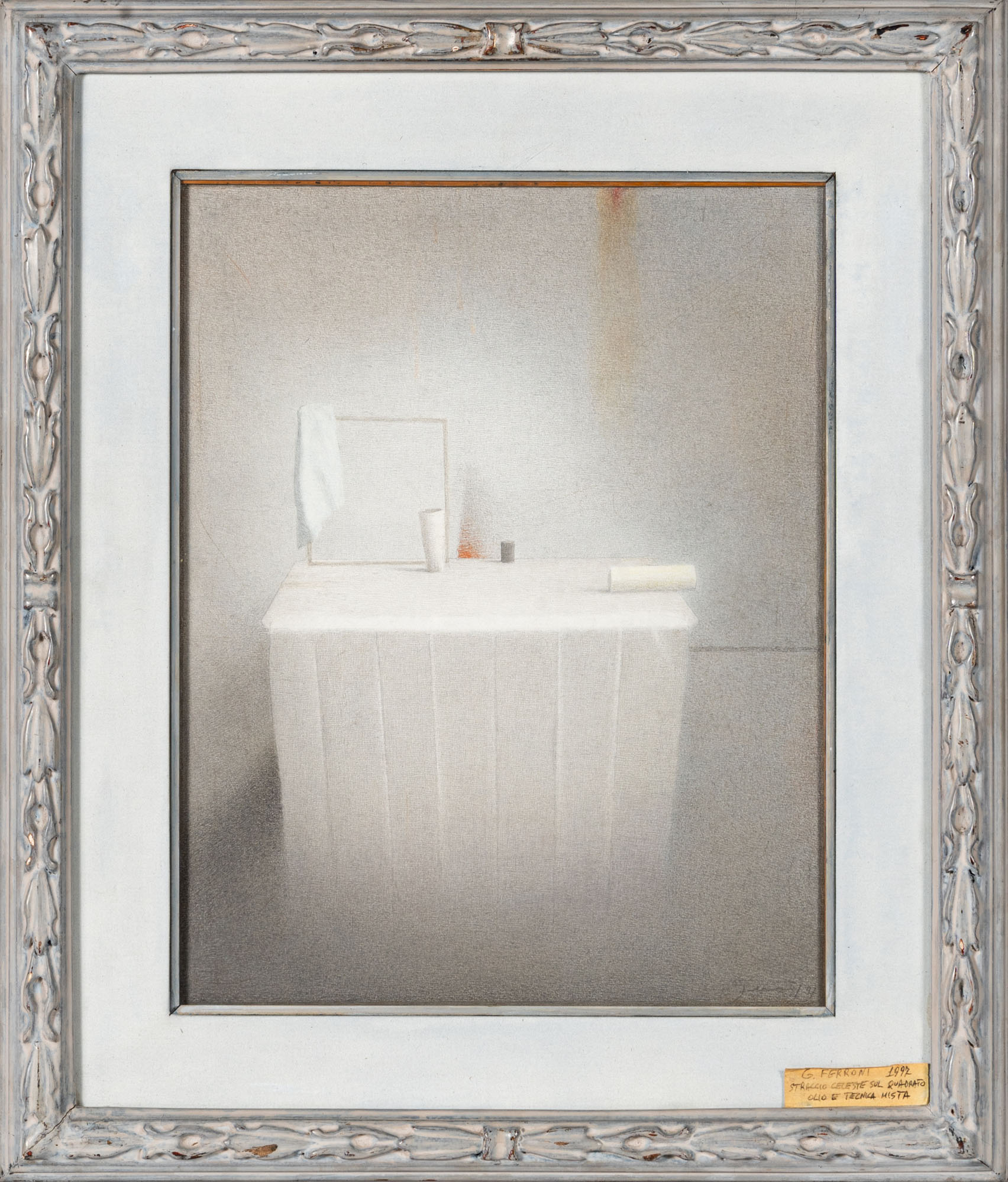 GIANFRANCO FERRONI(1927 - 2001)Straccio celeste sul quadrato1997Tecnica mista su carta applicata su tela44,5 x 35 cmFirmato e datato in basso a destraTitolo al retroOpera accompagnata da autentica su fotografia firmata dall'artistaOpera in corso di archiviazione presso l'Archivio Gianfranco Ferroni, BergamoPROVENIENZA:Collezione privata, Padova
