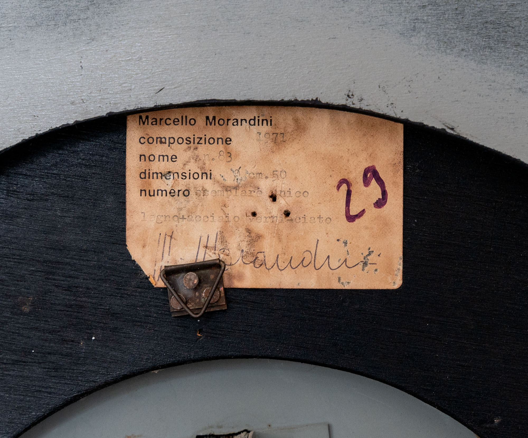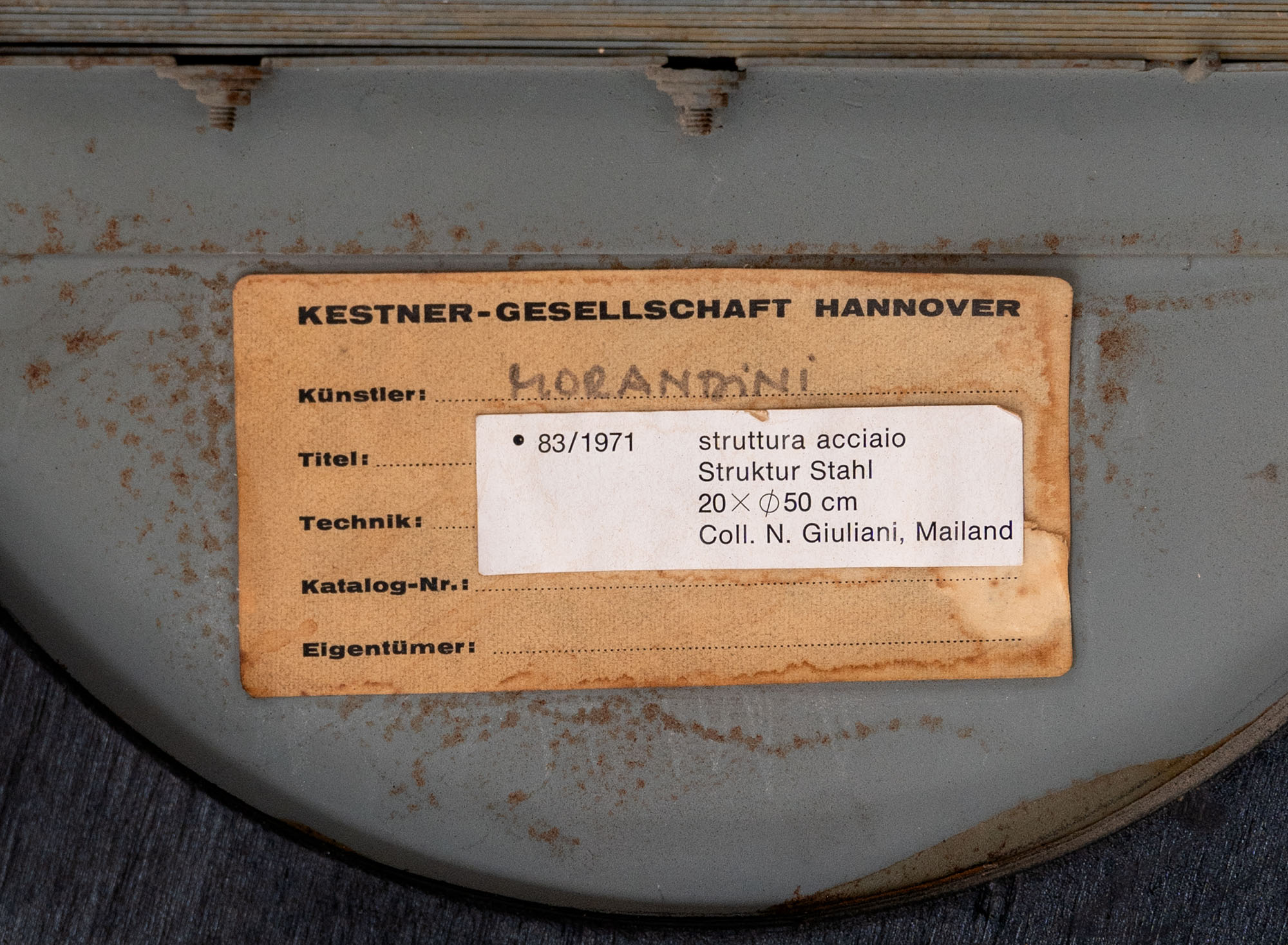 MARCELLO MORANDINI(1940)831971Scultura in acciaio verniciato, esemplare unicoDiametro 50 x 20 cmFirma, data e titolo al retroFirma su etichetta al retroOpera accompagnata da autentica su fotografia firmata dall'artistaPROVENIENZA:Kestner-Gesellschaft, Hannover (etichetta al retro)Collezione N. Giuliani, MilanoCollezione privata, PaviaESPOSIZIONI:1 - 15 giugno 1971, Marcello Morandini - Mostra no. 585, Galleria del Naviglio, Milano6 ottobre - 5 novembre 1972, Marcello Morandini, Kestner-Gesellschaft, HannoverBIBLIOGRAFIA:M. Meneguzzo, Marcello Morandini. Catalogo Ragionato, Skira, 2020, n. 267, p. 113 (ill.)AA.VV., Marcello Morandini, catalogo della mostra tenutasi presso la Galleria del Naviglio, Milano, 1971, p. 4AA.VV., Marcello Morandini, catalogo della mostra tenutasi presso la Kestner-Gesellschaft, Hannover, 1972, p. 80P. Pfeiffer, Marcello Morandini 1964/1975, Peter Pfeiffer, Milano, p. 49M. Fath, Zur Ausstellung, in Marcello Morandini. Skulpturen, Strukturen, Zeichnungen, catalogo dell mostra tenutasi presso il Wilhelm-Hack-Museum, Ludwigshafen, p. 60L. Magagnato, in Marcello Morandini, catalogo della mostra tenutasi presso il Museo di Castelvecchio, Verona, Nicolini Editore, p. 140AA.VV., Marcello Morandini Analysen - Entwürfe - Realisationen. Ausstellungsräumen im Stadttheater, Ingoldstadt, 1987, catalogo della mostra tenutasi presso il Ausstellungsräume im Stadttheater, Ingolstadt