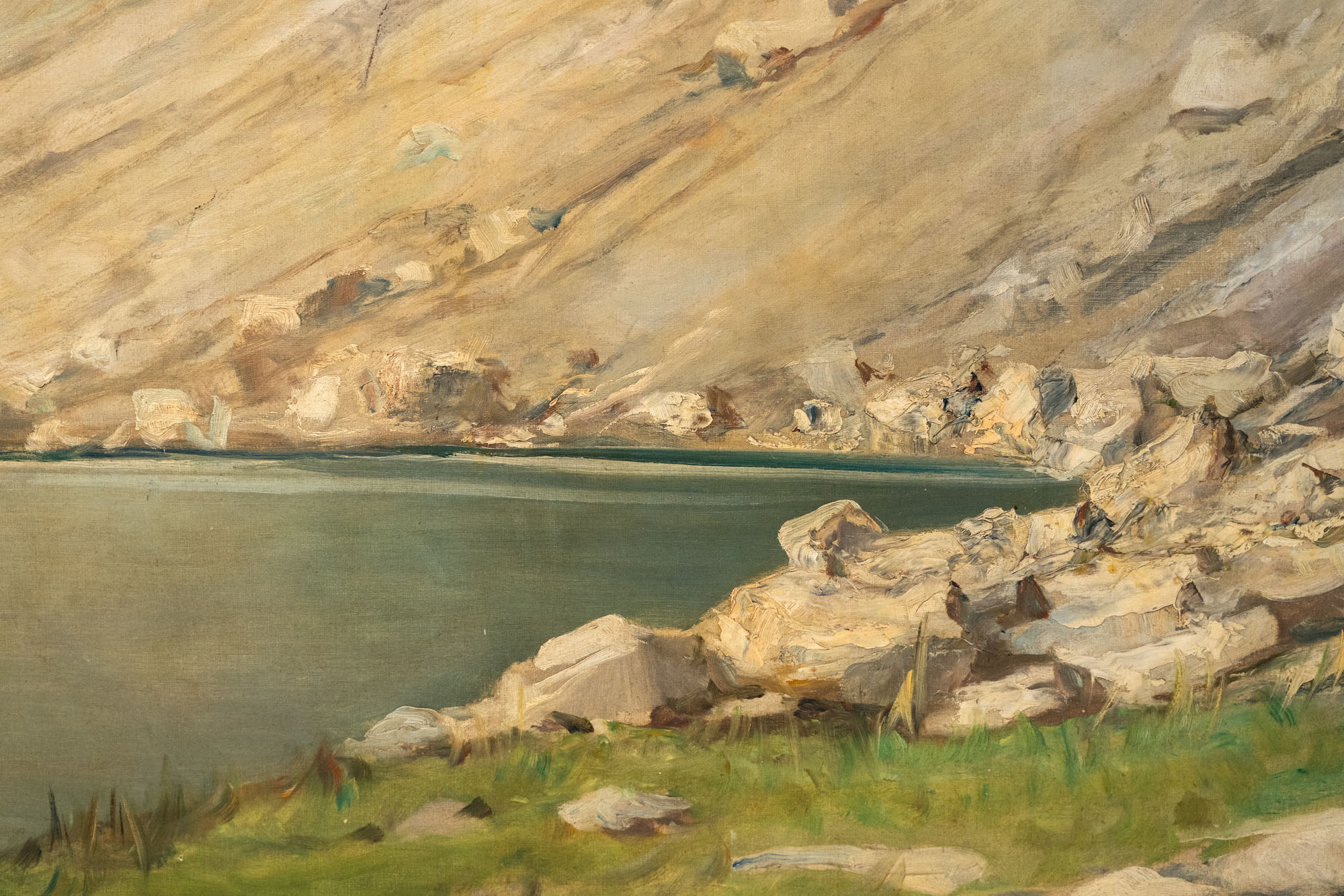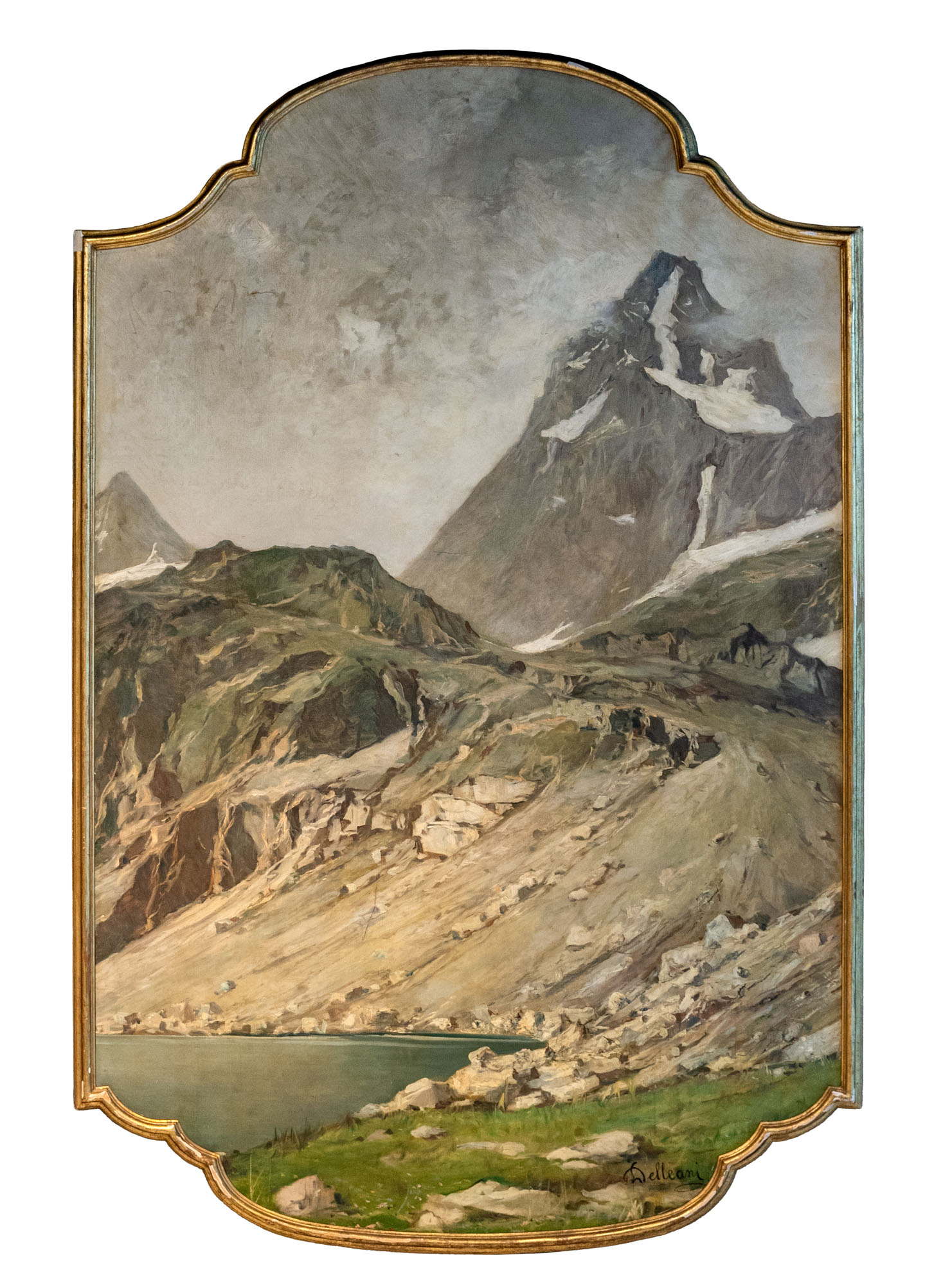 LORENZO DELLEANI(1840 - 1908)Il Monviso col lago di Fiorenza e il Pian del Re1898Olio su tela285 x 185 cmFirmato in basso a destraProprio al Delleani, il Comitato esecutivo dell'Esposizione del 1898 aveva chiesto di dipingere quattro grandi tele destinate a ornare il peristilio attraverso il quale, dall'ingresso principale della rassegna, si poteva accedere alle sale dedicate alle Belle Arti.La rassegna di Belle Arti che, nell'ambito della più vasta manifestazione espositiva, si tenne al Valentino da maggio a ottobre, riunì ancora una volta a Torino centinaia di artisti italiani. E fu quasi in loro omaggio che il Delleani pensò di dipingere nelle quattro tele decorative altrettanti squarci plastici che costituissero una specie di sintesi ideale dell'Italia: l'aguzza piramide del Monviso, un 'ridente' lembo del Lago di Garda con l'Alpe tirolese in lontananza, una luminosa marina sicula con Taormina sullo sfondo e una assolata visione del tevere, fluente tra il dorato verdeggiare dei prati oltre i quali la città eterna si profila innalzando nel cielo le cupole delle sontuose sue basiliche.PROVENIENZA:Collezione privata, BiellaESPOSIZIONI:Maggio - ottobre 1898, Esposizione Nazionale, TorinoBIBLIOGRAFIA:A. Dragone, Delleani. La vita, l'opera e il suo tempo, vol. 2, Cassa di Risparmio di Biella, 1973, p. 217AA.VV., L'arte all'Esposizione Nazionale del 1898, Torino, 1898, pp. 19-21