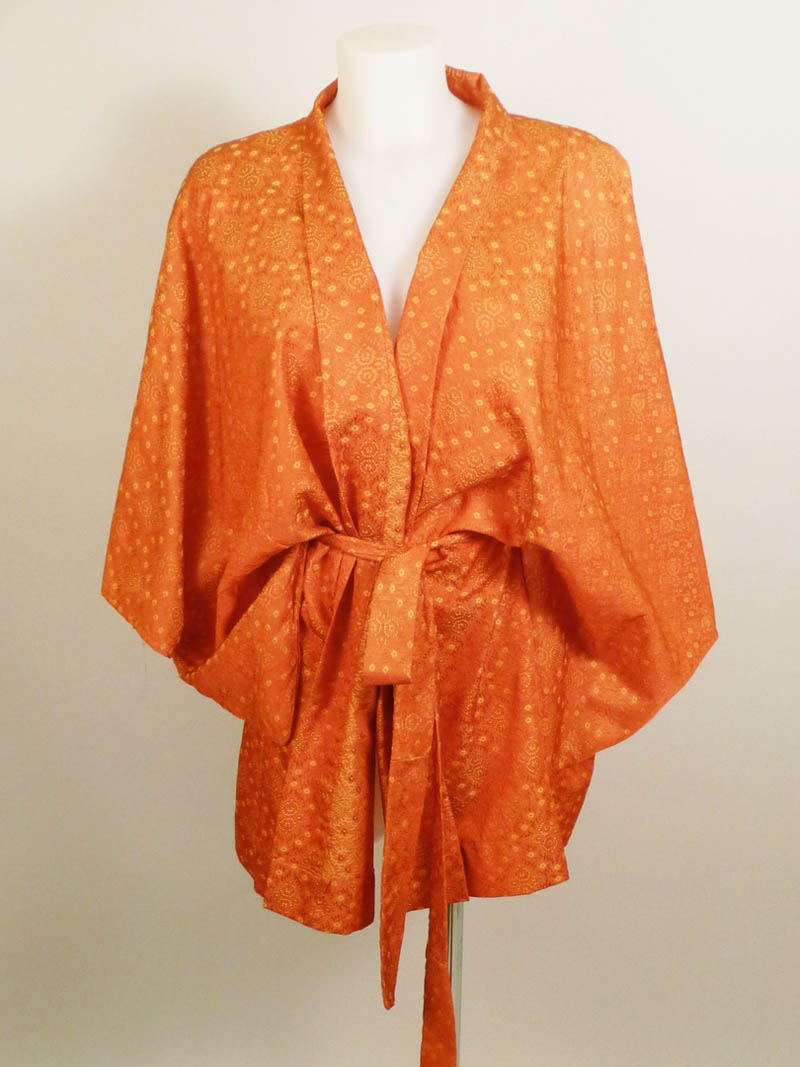 KIMONO IN SETA ARANCIO - ORANGE SILK KIMONO fantasia ricamata a fili gialli e arancio, manica ampia, cinturino tg M circa