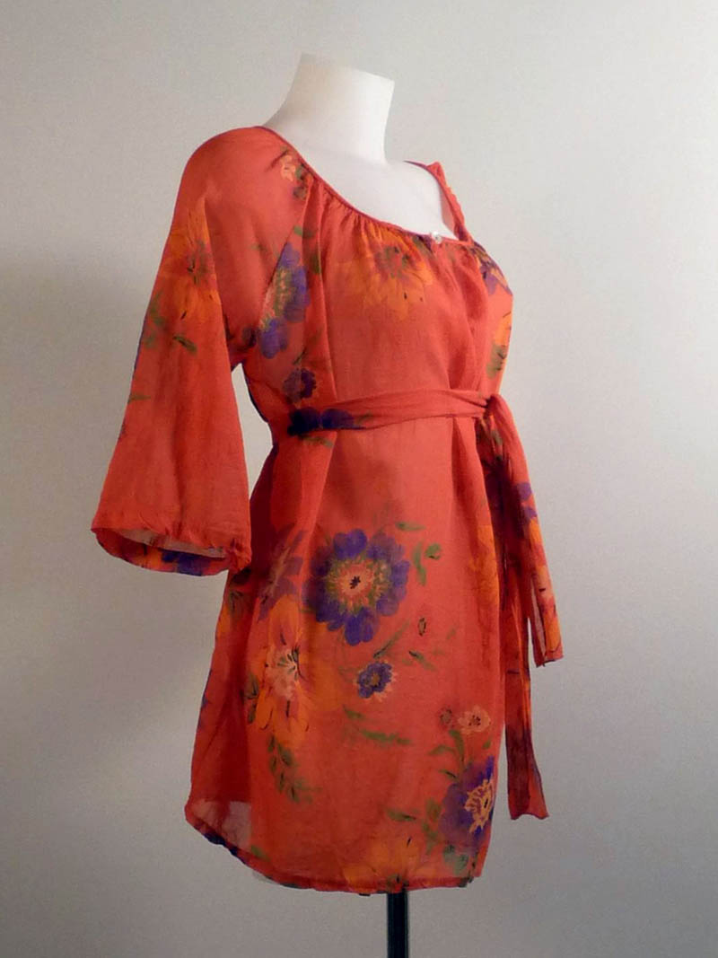 CAMICIA IN COTONE - COTTON BLOUSE scollo con piccolo bottone in madreperla, motivi floreali nei toni del viola, verde e giallo su fondo rosso, cinturino, maniche a tre quarti tg L