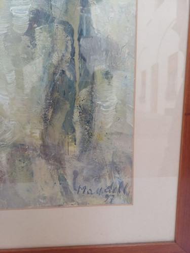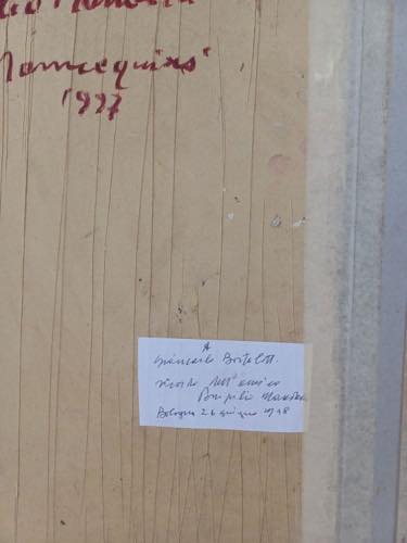 Pompilio Mandelli (Luzzara 1912 - Bologna 2006). Mannequins, 1997. Cm. 49,5x34. In cornice cm. 67x 51,5. Olio su tavola di cartone rigido. Firmato in basso a destra Mandelli 97. Firmato, titolato e datato al verso Pompilio Mandelli / Mannequins / 1997. Al verso presente dedica su etichetta.
