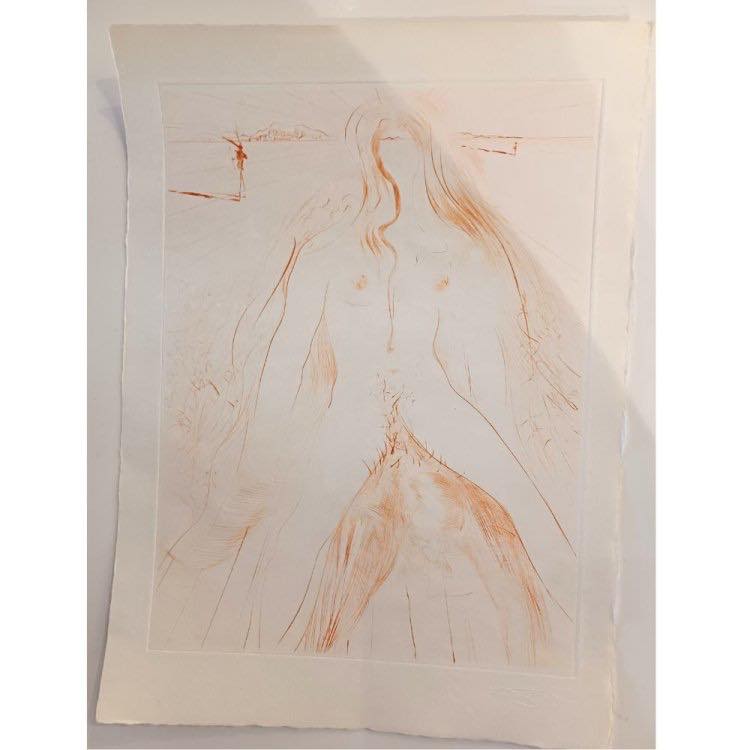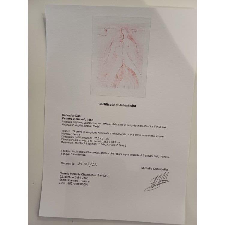 Salvador Dalì (Figueres, 1904 - Figueres, 1989), Femme à cheval, 1968. Lastra cm. 23,5x31, foglio cm. 28,5x38,3. Incisione a puntasecca. Tiratura 79 prove in sanguigna nè firmate nè numerate + 448 prove in nero non firmate. Dalla suite in sanguigna del libro La Vénus aux Fourrures. Argillet Editore, Parigi. Accompagnata da certificato di autenticità a firma Michelle Champetier, Galerie Michelle Champetier, Cannes, Francia.