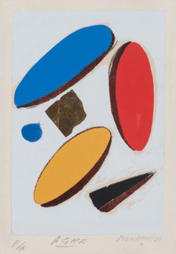 Sante Monachesi (Macerata 1910 - Roma 1991). Agrà. Cm. 32,5x22,5 (foglio). Litografia a colori su carta. Firmata a matita in basso a destra Monachesi. Titolata a matita in basso al centro Agrà. Numerazione a matita in basso al sinistra P/A. Con cornice.