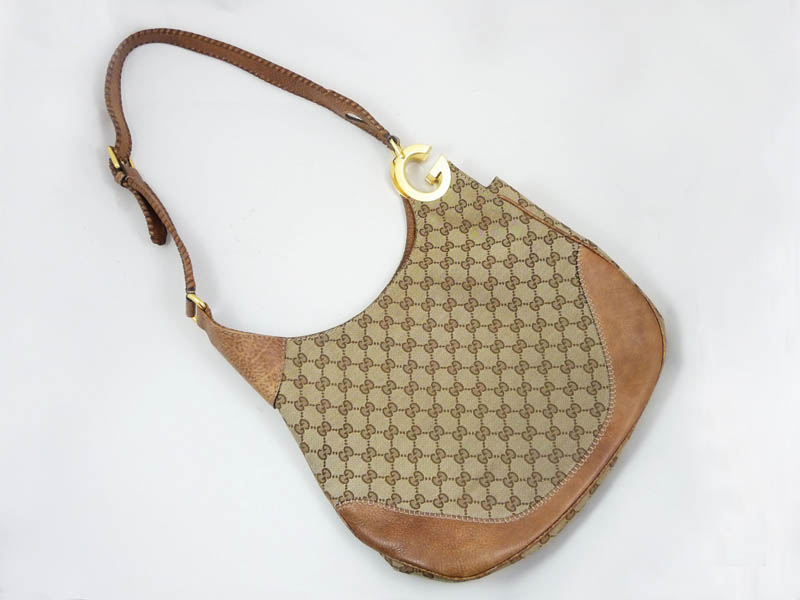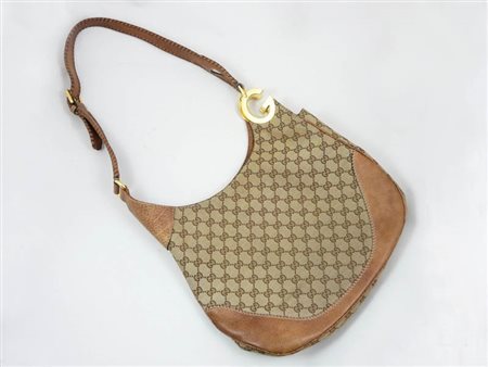 GRANDE BORSA IN TESSUTO MONOGRAM E PELLE - BIG LEATHER AND MONOGRAM FABRIC BAG Gucci nei toni del beige con tracolla in pelle marrone e dettagli in metallo dorato