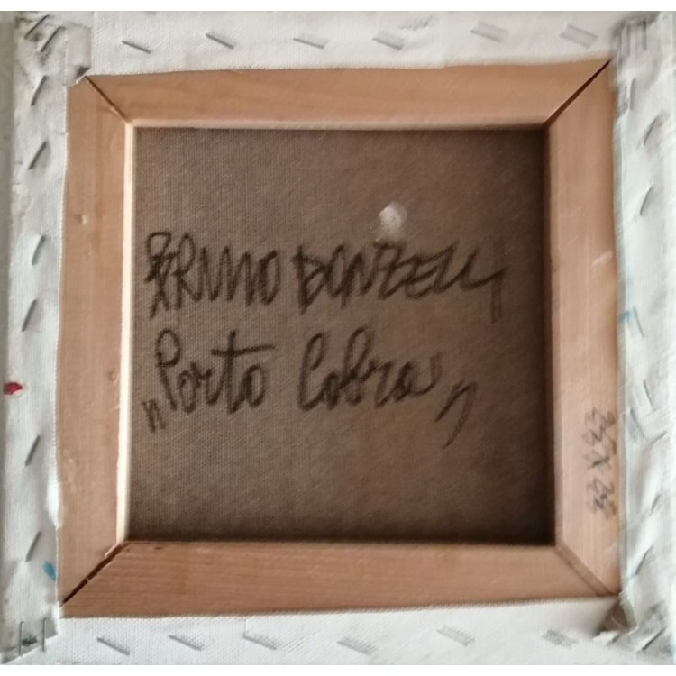 Bruno Donzelli ( Napoli 1941). Porto Cobra. Cm 25x25. Tecnica mista su tela. Firmata in basso a sinistra Donzelli. Al verso firmato e titolato Bruno Donzelli Porto Cobra. Autentica fotografica firmata dall'artista.