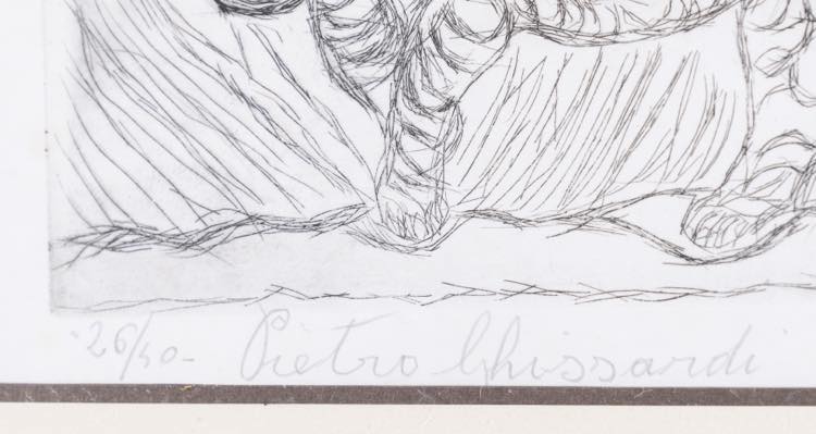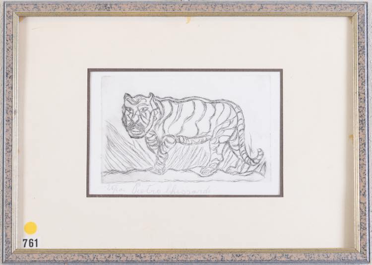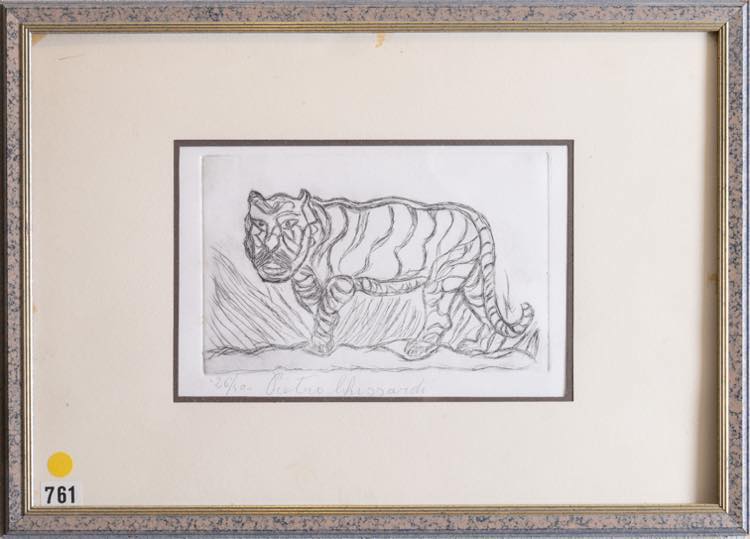 Pietro Ghizzardi (Viadana 1906 - Boretto 1986). Tigre che cammina. Cm. 16x24,5 (lastra). Cm. 35x50 (foglio). In cornice cm. 38,5x54. Incisione su carta. Numerata e firmata a matita in basso a sinistra 26/40 Pietro Ghizzardi. In cornice con vetro.