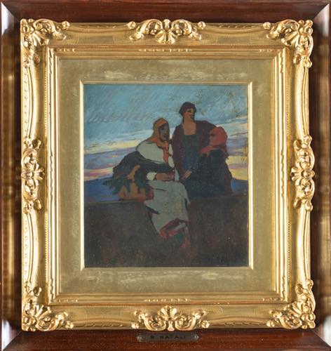 Renato Natali (Livorno 1883 - 1979). Popolane. Cm. 21,5x19,5. Olio su faesite. Firmato in basso a destra. Entro cornice.