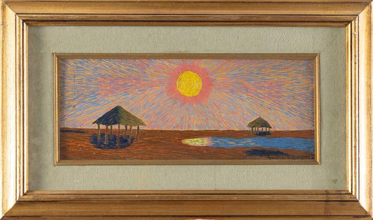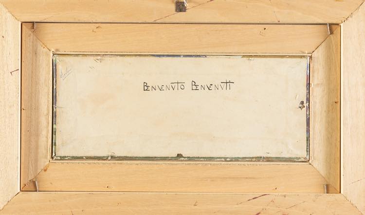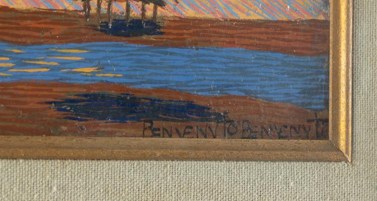 Benvenuto Benvenuti (Livorno 1881 - 1959). Spiaggia assolata. Cm. 15,5x39. Olio su compensato. Firmato in basso a destra BENVENUTO BENVENUTI. Al verso firmato BENVENUTO BENVENUTI. Entro cornice.