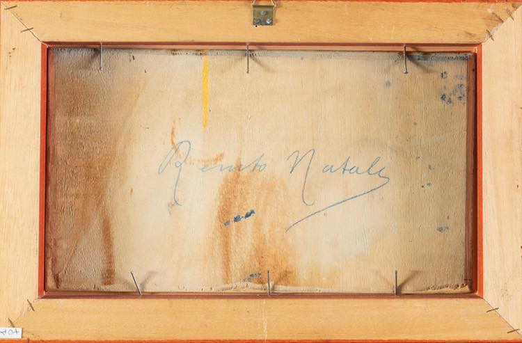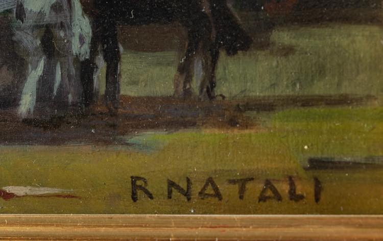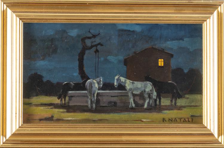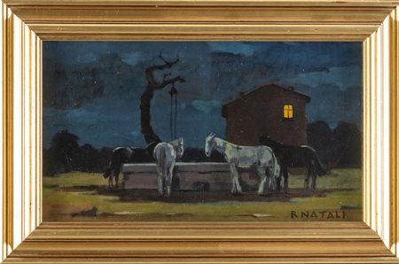 Renato Natali (Livorno 1883 - 1979). Paesaggio notturno con cavalli. Cm. 18,5x33. Olio su compensato. Firmato in basso a destra R. NATALI. Al verso firmato Renato Natali. Entro cornice.
