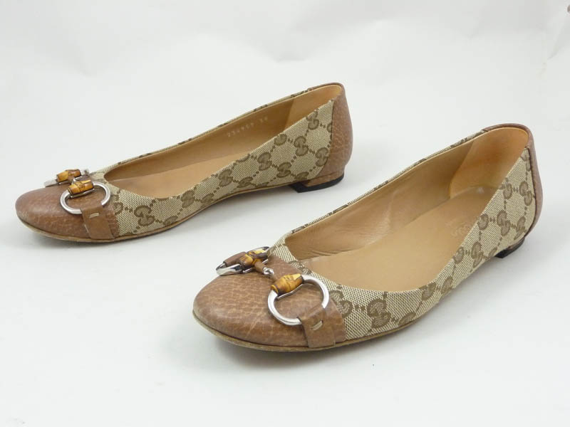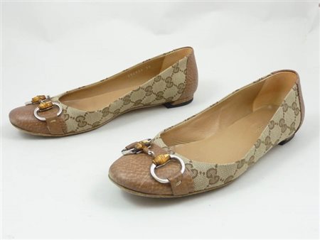 PAIO DI BALLERINE IN TESSUTO MONOGRAM - PAIR OF BALLET FLAT IN MONOGRAM FABRIC dettaglio in bamboo, inserti in pelle marrone, difetti