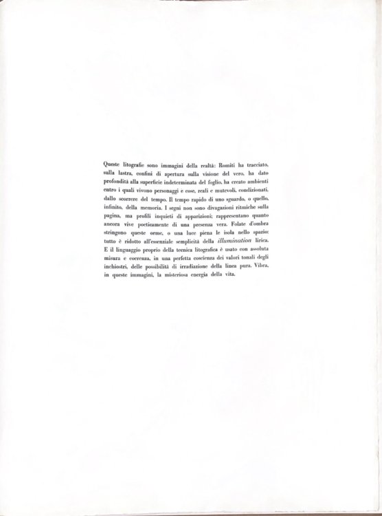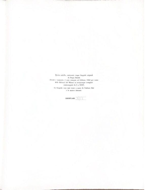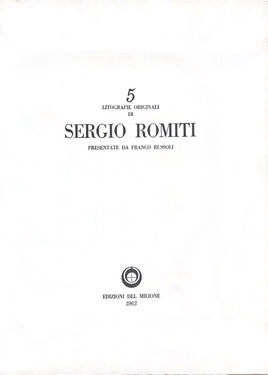 Sergio Romiti (Bologna 1928 - 2000). Cartella di 5 litografie, 1963. Ciascuna cm. foglio 69x53. Litografie numerate e firmate stampate nel 1963 per conto delle Edizioni del Milione in trentacinque esemplari. Litografie tirate a mano da Giuliano Zini e successivamente distrutte le matrici. Esemplare XXIV.