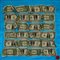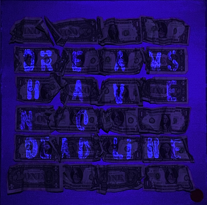 Tecnica mista colore acrilico turchese realizzato con applicazione di banconote americane 1USD con scritte fotosensibili trasparenti blu