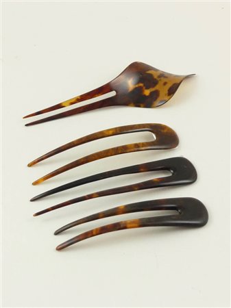 QUATTRO FORCINE IN TARTARUGA - FOUR TURTLE HAIRPIN inizio del XX secolo - early 20th century una delle quali modellata come un piccolo ventaglio