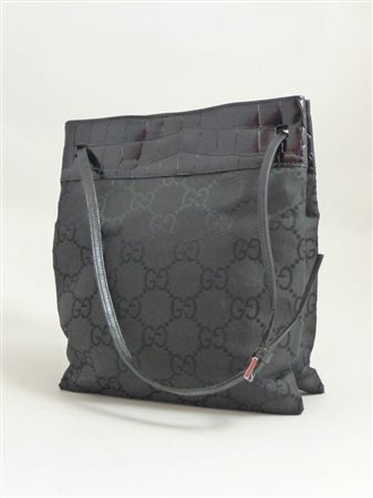 PICCOLA BORSA NERA IN TESSUTO MONOGRAM E PELLE - BLACK LEATHER AND MONOGRAM FABRIC BAG Gucci tracolla sottile in pelle, lievi difetti